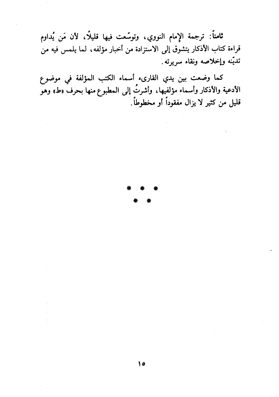 ثامنًا: ترجمة الإمام النووي، وتوسّعت فيها قليلًا، لأن مَن يُداوم قراءة كتاب الأذكار يتشوق إلى الاستزادة من أخبار مؤلفه، لما يلمس فيه من تديّنه وإخلاصه ونقاء سريرته.