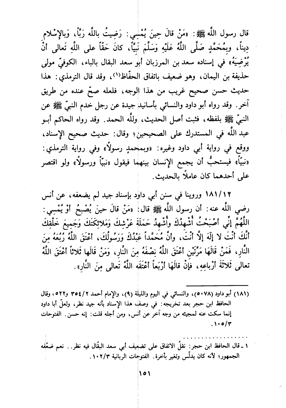 [181] أبو داود (5078)، والنسائي في اليوم والليلة (9)، والإِمام أحمد 2/ 354 و 522، وقال الحافظ ابن حجر بعد تخريجه: في وصف هذا الإِسناد بأنه جيد نظر، ولعلّ أبا داود إنما سكت عنه لمجيئه من وجه آخر عن أنس، ومن أجله قلت: إنه حسن. الفتوحات 3/ 105.