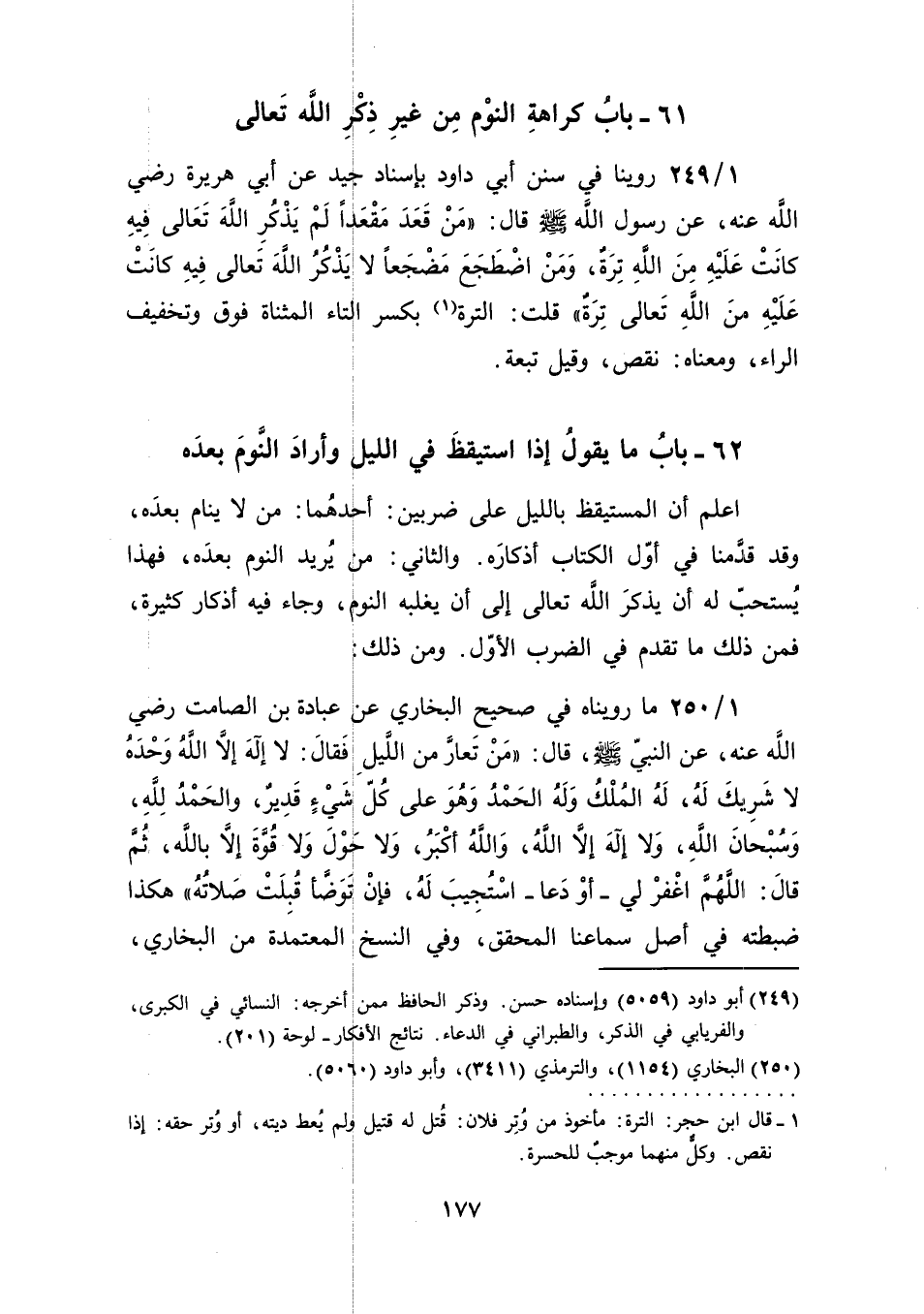 عن النبيّ صلى الله عليه وسلم، قال: "مَنْ تَعارَّ من اللَّيلِ فَقالَ: لا إِلهَ إِلاَّ اللَّهُ وَحْدَهُ لا شَرِيكَ لَهُ، لَهُ المُلْكُ وَلَهُ الحَمْدُ وَهُوَ على كُل شَيْءٍ قَدِيرٌ، والحَمْدُ لِلَّهِ، وَسُبْحانَ اللَّهِ، وَلا إِلهَ إِلاَّ اللَّهُ، وَاللَّهُ أكْبَرُ، وَلا حَوْلَ ولا قُوَّةَ إلإِلاَّ باللَّهِ، ثُمَّ قَالَ: اللَّهُمَّ اغْفرْ لي ـ أوْ دَعا ـ اسْتُجِيبَ لَهُ، فإنْ تَوَضَّأ قُبِلَتْ صَلاتُهُ" هكذا ضبطته في أصل سماعنا المحقق، وفي النسخ المعتمدة من البخاري،