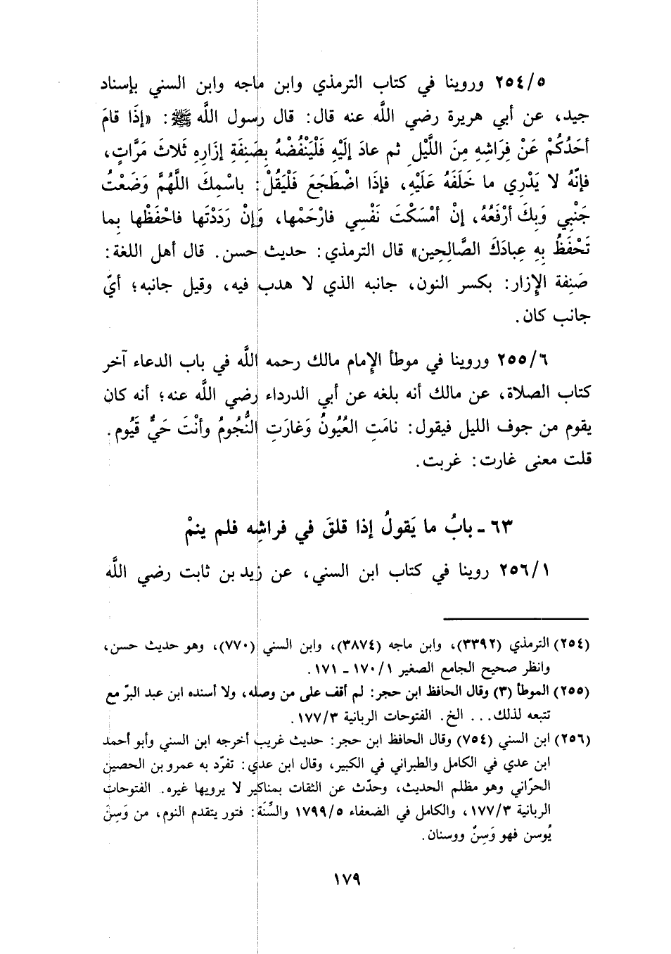 قال رسول الله صلى الله عليه وسلم:"إذَا قامَ أحَدُكُمْ عَنْ فِرَاشِهِ مِنَ اللَّيْلِ ثم عادَ إِلَيْهِ فَلْيَنْفُضْهُ بِصَنِفَةِ إِزَارِهِ ثَلاث مَرَّاتٍ، فإنَّهُ لا يَدْرِي ما خَلَفَهُ عَلَيْهِ، فإذَا اضْطَجَعَ فَلْيَقُلْ: باسْمِكَ اللَّهُمَّ وَضَعْتُ جَنْبِي وَبِكَ أرْفَعُهُ، إِنْ أمْسَكْتَ نَفْسِي فارْحَمْها، وَإِنْ رَدَدْتَها فاحْفَظْها بِما تَحْفَظُ بِهِ عِبادَكَ الصَّالِحين" قال الترمذي: حديث حسن. قال أهل اللغة: صَنِفة الإِزار: بكسر النون، جانبه الذي لا هدب فيه، وقيل جانبه؛ أيّ جانب كان.
