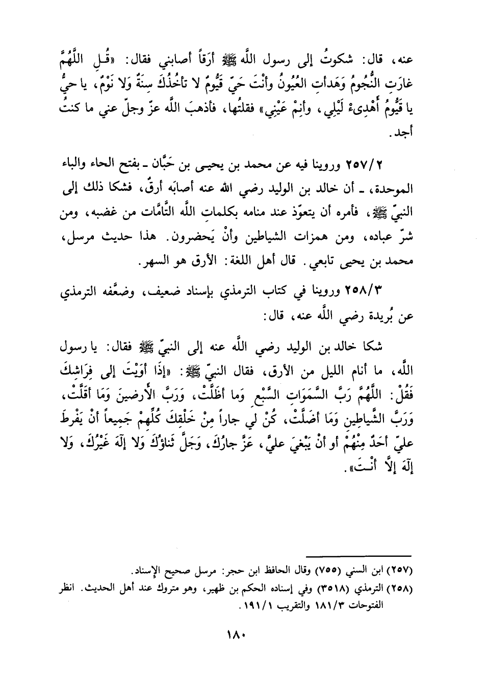 ـ أن خالد بن الوليد رضي الله عنه أصابَه أرقٌ، فشكا ذلك إلى النبيّ صلى الله عليه وسلم، فأمره أن يتعوّذ عند منامه بكلماتِ اللَّه التَّامَّات من غضبه، ومن شرّ عباده، ومن همزات الشياطين وأنْ يَحضرون. هذا حديث مرسل، محمد بن يحيى تابعي. قال أهل اللغة: الأرق هو السهر.