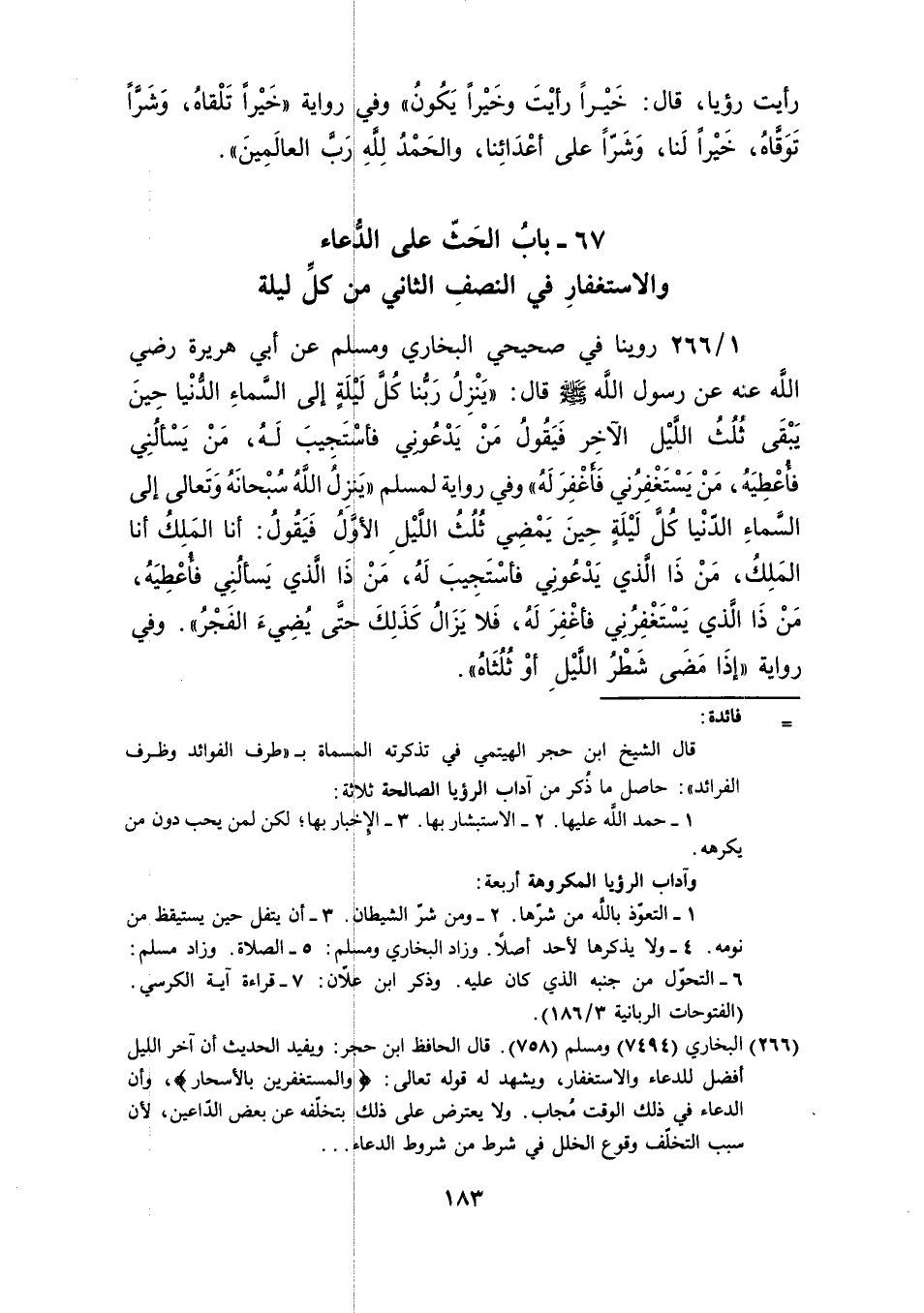 67 ـ بابُ الحَثّ على الدًّعاء والاستغفارِ في النصفِ الثاني من كلِّ ليلة