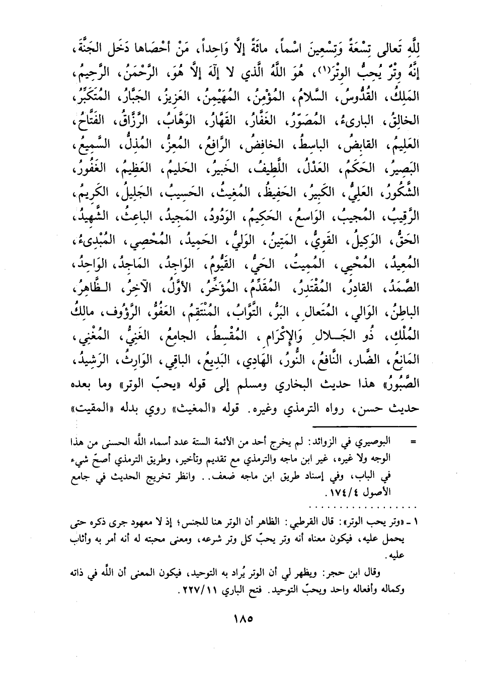 لِلَّهِ تَعالى تِسْعَةً وَتِسْعِينَ اسْمًا، إِلاَّ وَاحِدًا، مَنْ أحْصَاها دَخَلَ الجَنَّةَ، إنَّهُ وِتْرٌ يُحِبُّ الوِتْرِ (¬1)،