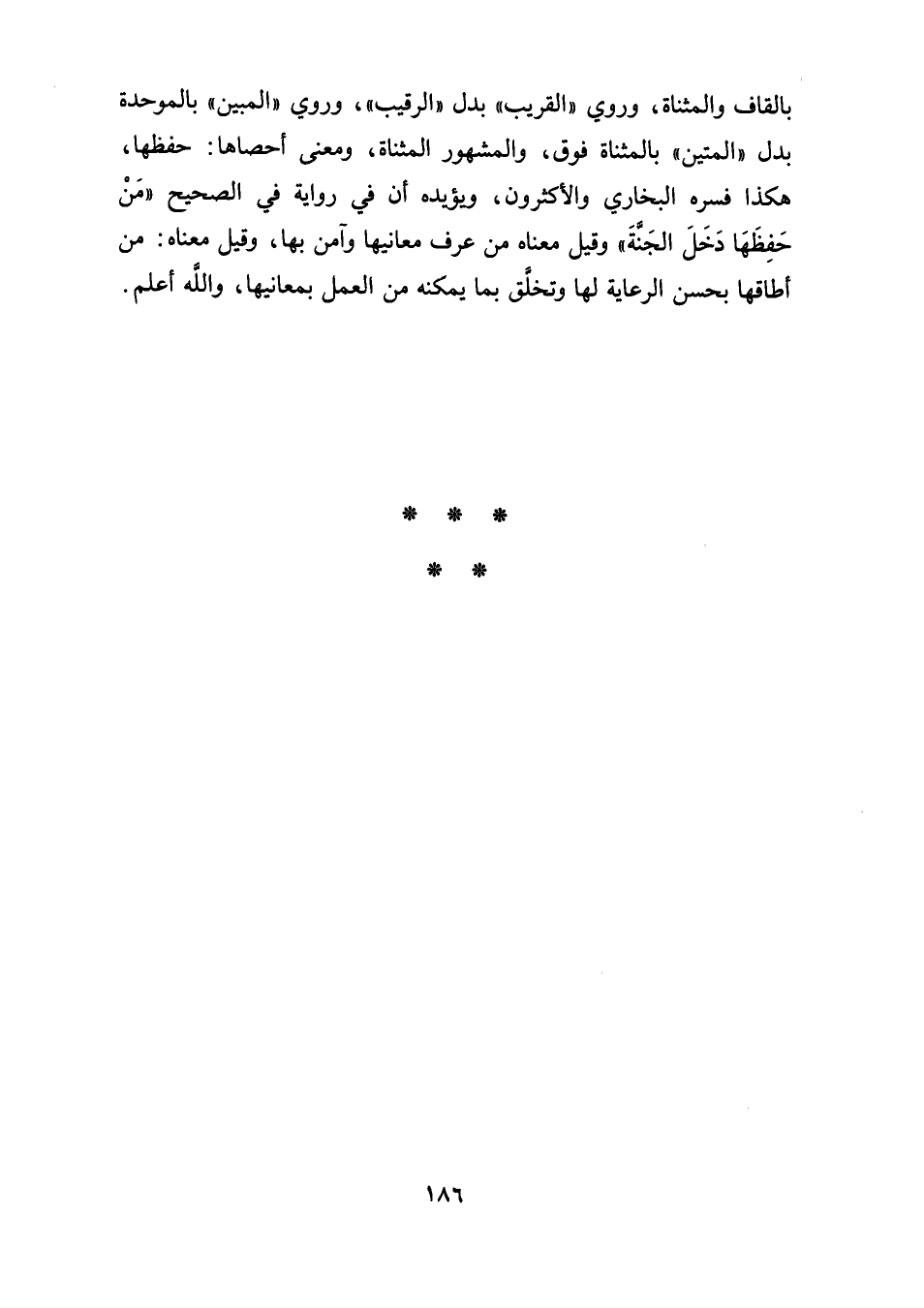 بالقاف والمثناة، وروي "القريب" بدل "الرقيب"، وروي "المبين" بالموحدة بدل "المتين" بالمثناة فوق، والمشهور المثناة، ومعنى أحصاها: حفظها، هكذا فسره البخاري والأكثرون، ويؤيده أن في رواية في الصحيح "مَنْ حَفِظَهَا دَخَلَ الجَنَّةَ" وقيل معناه من عرف معانيها وآمن بها، وقيل معناه: من أطاقها بحسن الرعاية لها وتخلَّق بما يمكنه من العمل بمعانيها، والله أعلم.