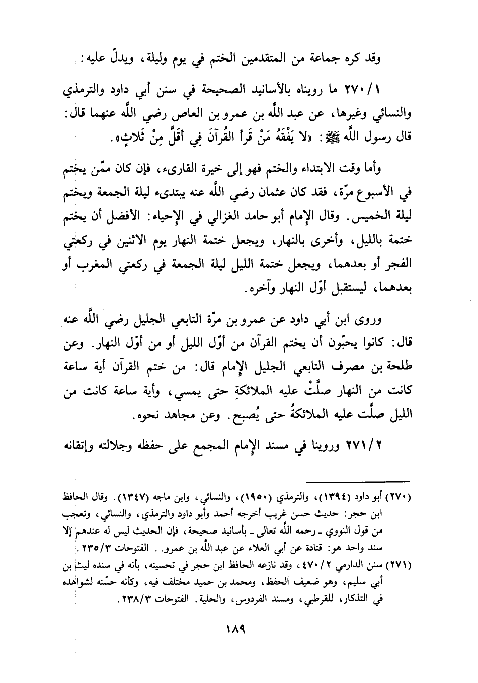 وقد كره جماعة من المتقدمين الختم في يوم وليلة، ويدلّ عليه: