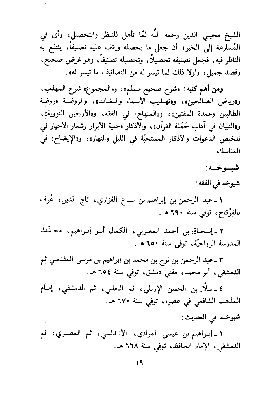 " شرح صحيح مسلم" و"المجموع" شرح المهذب، و"رياض الصالحين"، و"تهذيب الأسماء واللغات"، والروضة "روضة الطالبين وعمدة المفتين"، و"المنهاج" في الفقه و "الأربعين النووية"، و"التبيان في آداب حَمَلة القرآن"، والأذكار "حلية الأبرار وشعار الأخيار في تلخيص الدعوات والأذكار المستحبّة في الليل والنهار"، و"الإِيضاح" في المناسك.