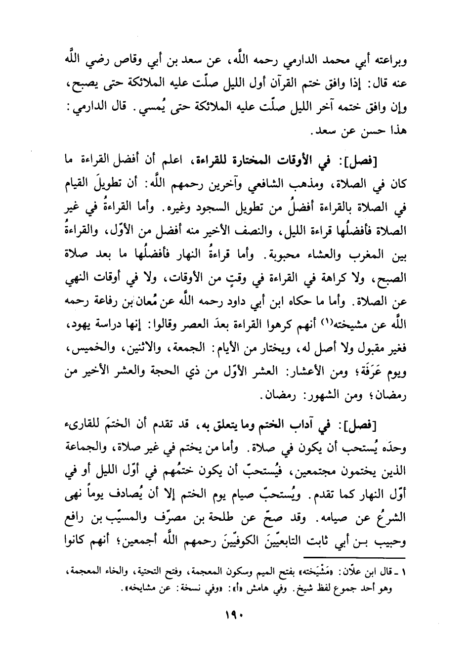 [فصل]: في آداب الختم وما يتعلق به، قد تقدم أن الختم للقارىء وحدَه يُستحب أن يكون في صلاة. وأما من يختم في غير صلاة، والجماعة الذين يختمون مجتمعين، فيُستحبّ أن يكون ختمُهم في أوّل الليل أو في أوّل النهار كما تقدم. ويُستحبّ صيام يوم الختم إلا أن يُصادف يومًا نهى الشرعُ عن صيامه. وقد صحّ عن طلحة بن مصرّف والمسيّب بن رافع وحبيب بن أبي ثابت التابعيّينَ الكوفيّينَ رحمهم الله أجمعين؛ أنهم كانوا