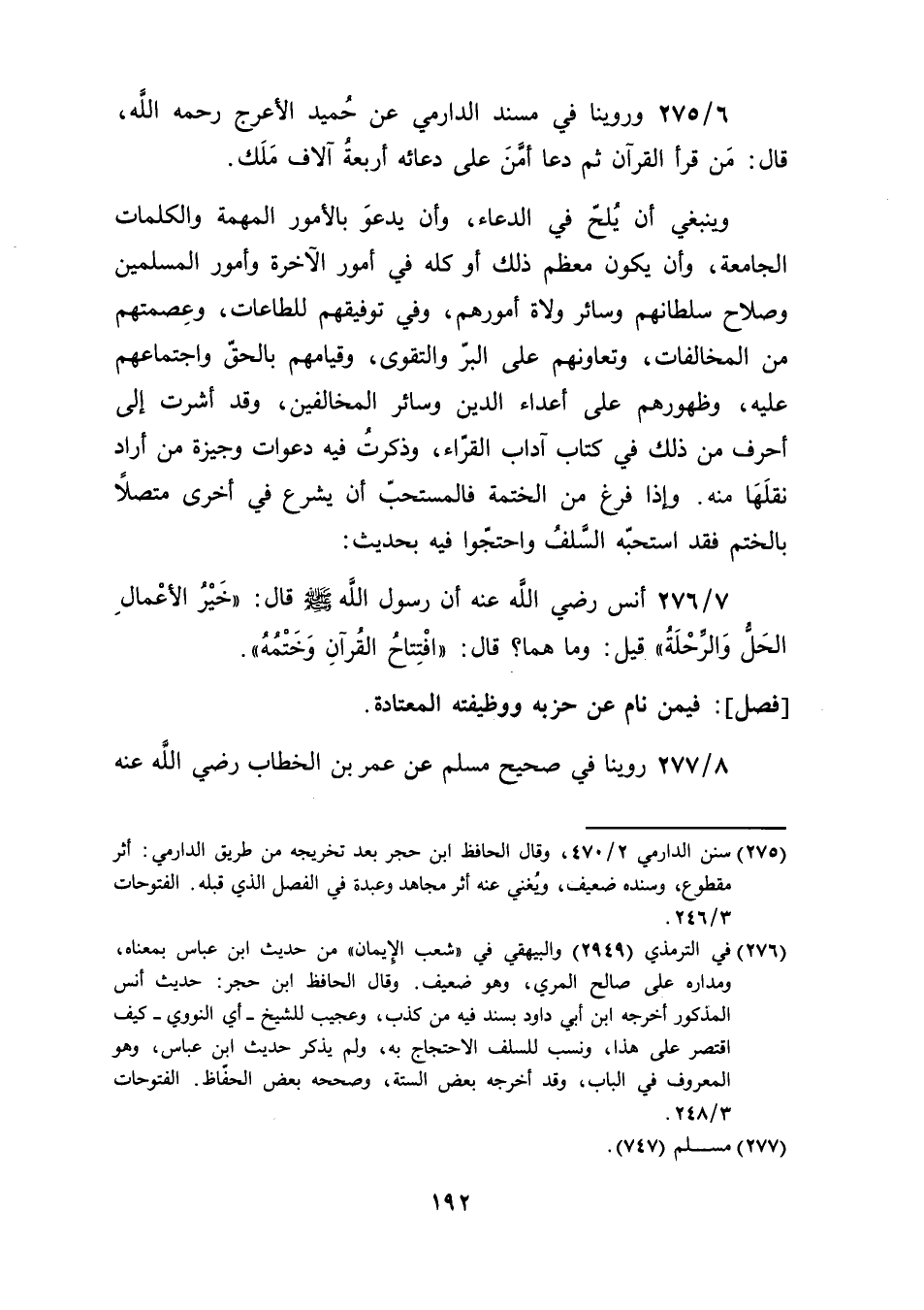 وينبغي أن يُلحّ في الدعاء، وأن يدعوَ بالأمور المهمة والكلمات الجامعة، وأن يكون معظم ذلك أو كله، في أمور الآخرة وأمور المسلمين وصلاح سلطانهم وسائر ولاة أمورهم، وفي توفيقهم للطاعات، وعِصمتهم من المخالفات، وتعاونهم على البرّ والتقوى، وقيامهم بالحقّ واجتماعهم عليه، وظهورهم على أعداء الدين وسائر المخالفين، وقد أشرت إلى أحرف من ذلك في كتاب آداب القرّاء، وذكرتُ فيه دعوات وجيزة من أراد نقلَهَا منه. وإذا فرغ من الختمة فالمستحبّ أن يشرع في أخرى متصلًا بالختم فقد استحبّه السَّلفُ واحتجّوا فيه بحديث: