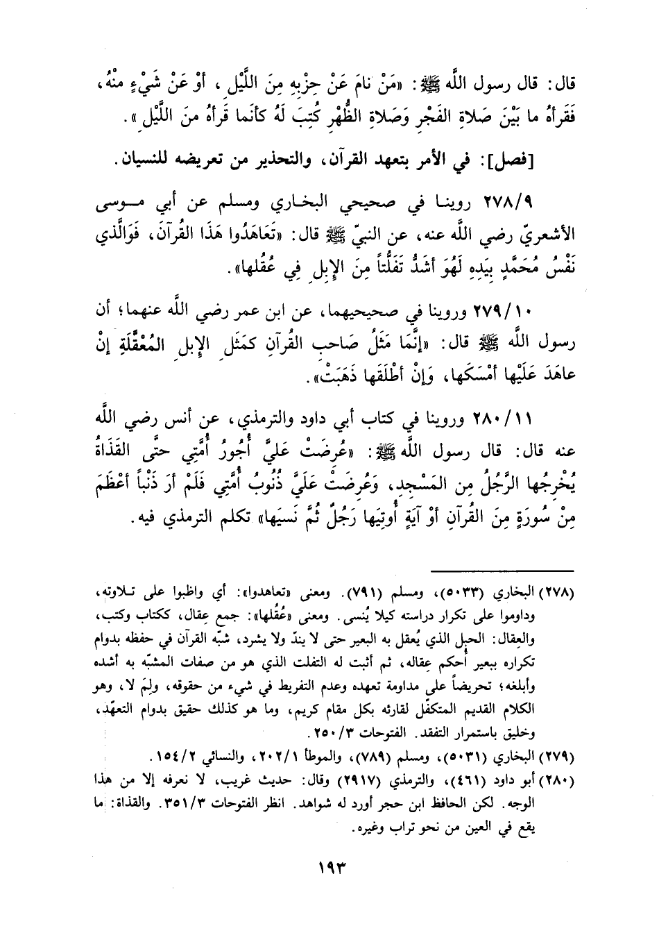[278] البخاري (5033)، ومسلم (791). ومعنى "تعاهدوا": أي واظبوا على تلاوته، وداوموا على تكرار دراسته كيلا يُنسى. ومعنى "عُقُلها": جمع عِقال، ككتاب وكتب، والعِقال: الحبل الذي يُعقل به البعير حتى لا يندّ ولا يشرد، شبّه القرآن في حفظه بدوام تكراره ببعيرًا أُحكم عِقاله، ثم أثبت له التفلت الذي هو من صفات المشبّه به أشده وأبلغه؛ تحريضًا على مداومة تعهده وعدم التفريط في شيء من حقوقه، ولِمَ لا، وهو الكلام القديم المتكفّل لقارئه بكل مقام كريم، وما هو كذلك حقيق بدوام التعهّد. وخليق باستمرار التفقد. الفتوحات 3/ 250.