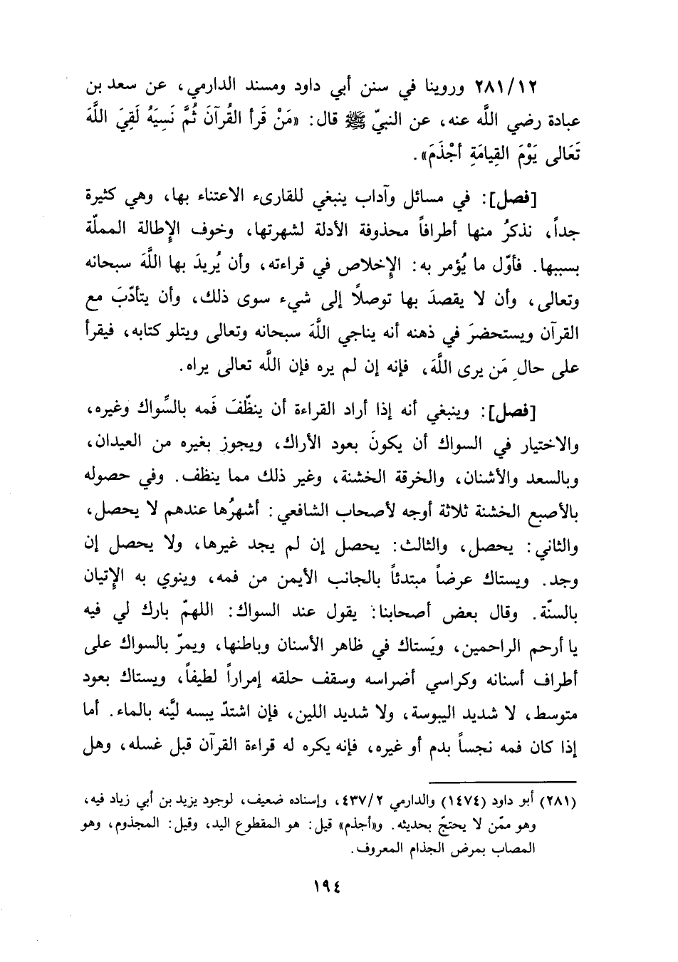 [فصل]: وينبغي أنه إذا أراد القراءة أن ينظّفَ فَمَهُ بالسِّواك وغيره، والاختيار في السواك أن يكونَ بعود الأراك، ويجوز بغيره من العيدان، وبالسعد والأشنان، والخرقة الخشنة، وغير ذلك مما ينظف. وفي حصوله بالأصبع الخشنة ثلاثة أوجه لأصحاب الشافعي: أشهرُها عندهم لا يحصل، والثاني: يحصل، والثالث: يحصل إن لم يجد غيرها، ولا يحصل إن وجد. ويستاك عرضًا مبتدئًا بالجانب الأيمن من فمه، وينوي به الإِتيان بالسنّة. وقال بعض أصحابنا: يقول عند السواك: اللهمَّ بارك لي فيه يا أرحم الراحمين! ويَستاك في ظاهر الأسنان وباطنها، ويمرّ بالسواك على أطراف أسنانه وكراسي أضراسه وسقف حلقه إمرارًا لطيفًا، ويستاك بعود متوسط، لا شديد اليبوسة، ولا شديد اللين، فإن اشتدّ يبسه ليَّنه بالماء. أما إذا كان فمه نجسًا بدم أو غيره، فإنه يكره له قراءة القرآن قبل غسله، وهل