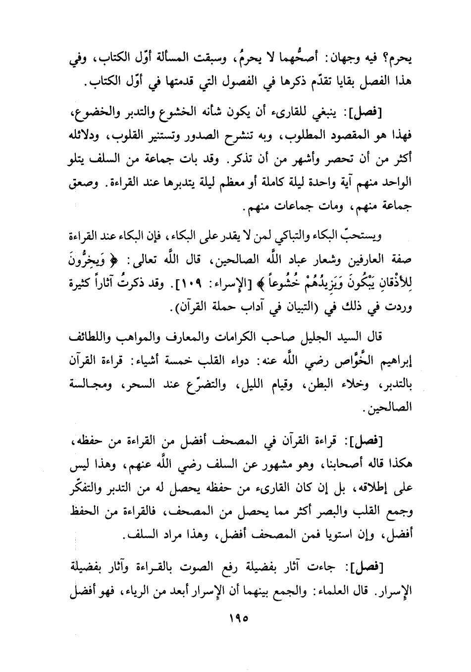 [فصل]: قراءة القرآن في المصحف أفضل من القراءة من حفظه، هكذا قاله أصحابنا، وهو مشهور عن السلف رضي الله عنهم، وهذا ليس على إطلاقه، بل إن كان القارىء من حفظه يحصل له من التدبر والتفكّر وجمع القلب والبصر أكثر مما يحصل من المصحف، فالقراءة من الحفظ أفضل، وإن استويا فمن المصحف أفضل، وهذا مراد السلف.