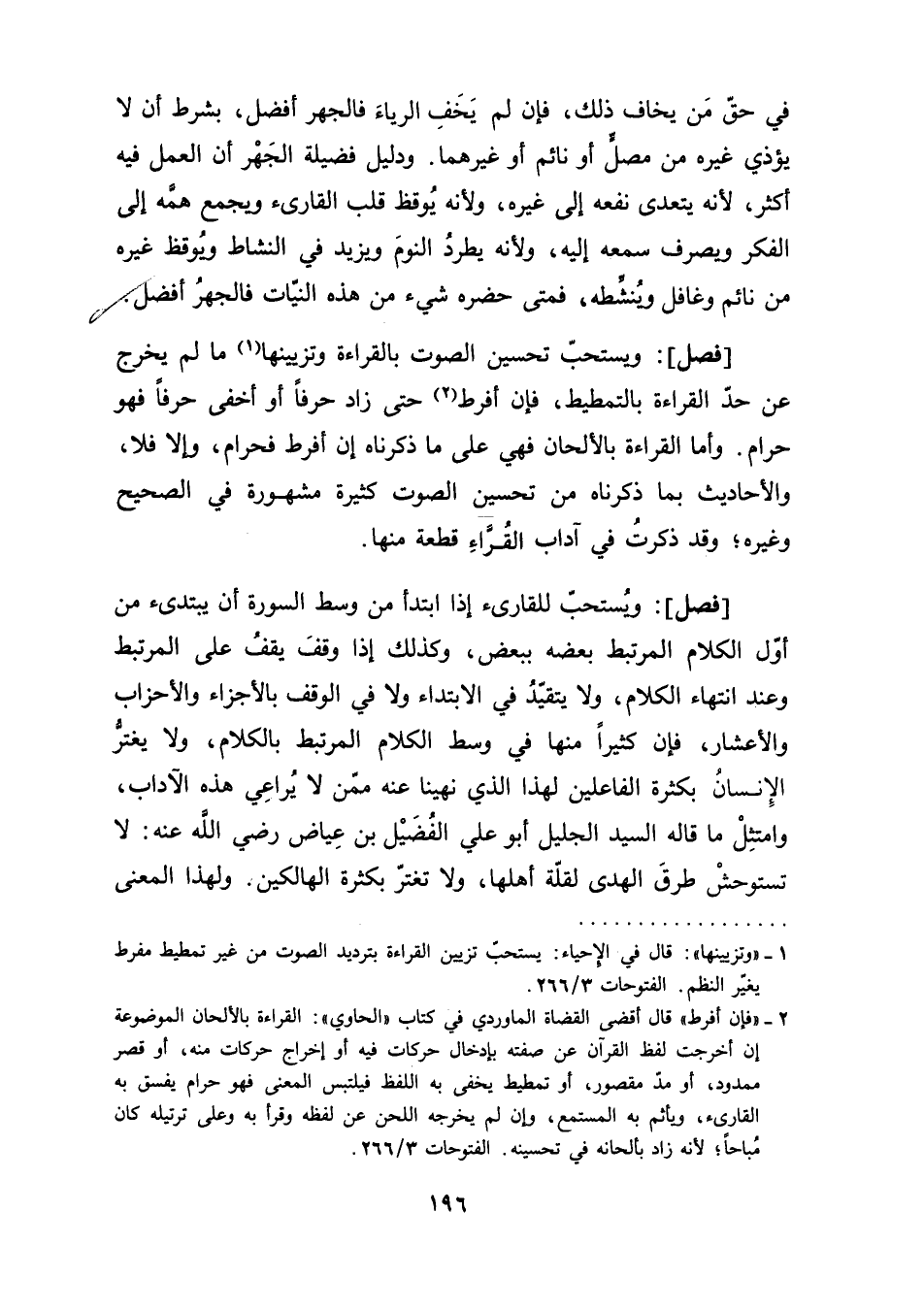 [فصل]: ويستحبّ تحسين الصوت بالقراءة وتزيينها (¬1) ما لم يخرج عن حدّ القراءة بالتمطيط، فإن أفرط (¬2) حتى زاد حرفًا أو أخفى حرفًا هو حرام. وأما القراءة بالألحان فهي على ما ذكرناه إن أفر فحرام، وإلا فلا، والأحاديث بما ذكرناه في تحسين الصوت كثيرة مشهورة في الصحيح وغيره؛ وقد ذكرتُ في آداب القُرَّاءِ قطعة منها.