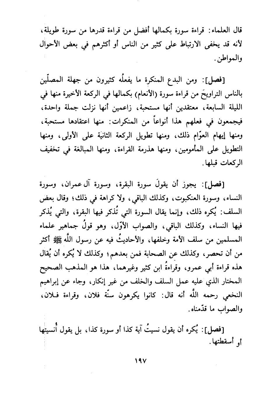 [فصل]: يجوز أن يقولَ: سورة البقرة، وسورة آل عمران، وسورة النساء، وسورة العنكبوت، وكذلك الباقي، ولا كراهة في ذلك؛ وقال بعض السلف: يُكره ذلك، وإنما يقال السورة التي تُذكر فيها البقرة، والتي يُذكر فيها النساء، وكذلك الباقي، والصواب الأوّل، وهو قولُ جماهير علماء المسلمين من سلف الأمة وخلفها، والأحاديثُ فيه عن رسول الله صلى الله عليه وسلم أكثر من أن تحصر، وكذلك عن الصحابة فمن بعدهم؛ وكذلك لا يُكره أن يُقال: هذه قراءة أبي عمرو، وقراءةُ ابن كثير وغيرهما، هذا هو المذهب الصحيح المختار الذي عليه عمل السلف والخلف من غير إنكار، وجاء عن إبراهيم النخعي رحمه الله أنه قال: كانوا يكرهون سنّة فلان، وقراءة فلان، والصواب ما قدّمناه.
