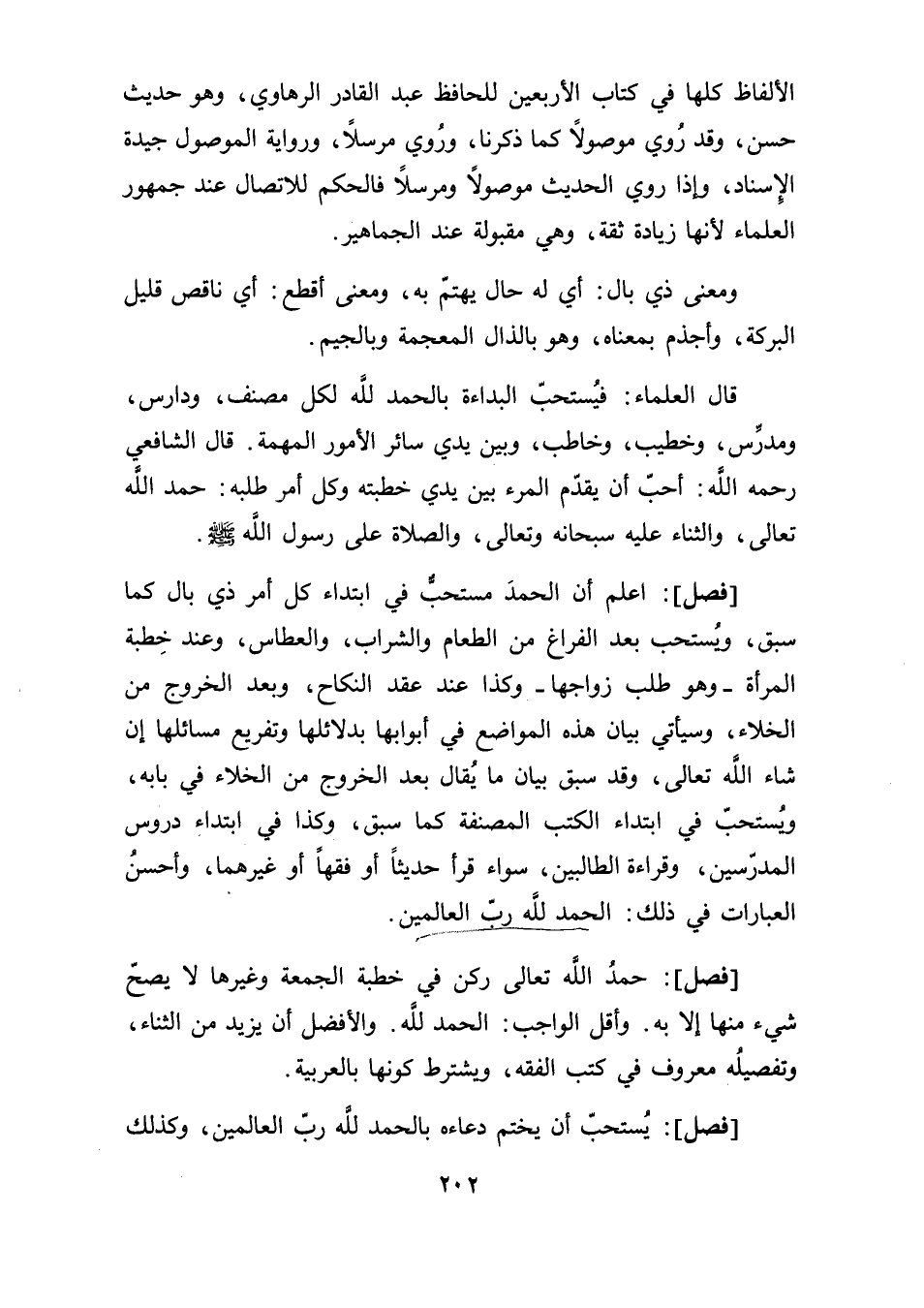 [فصل]: اعلم أن الحمدَ مستحبٌّ في ابتداء كل أمر ذي بال كما سبق، ويُستحب بعد الفراغ من الطعام والشراب، والعطاس، وعند خطبة المرأة ـ وهو طلب زواجها ـ وكذا عند عقد النكاح، وبعد الخروج من الخلاء، وسيأتي بيان هذه المواضع في أبوابها بدلائلها وتفريع مسائلها إن شاء الله تعالى، وقد سبق بيان ما يُقال بعد الخروج من الخلاء في بابه، ويُستحبّ في ابتداء الكتب المصنفة كما سبق، وكذا في ابتداء دروس المدرّسين، وقراءة الطالبين، سواء قرأ حديثًا أو فقهًا أو غيرهما، وأحسنُ العبارات في ذلك: الحمد لله رب العالمين.