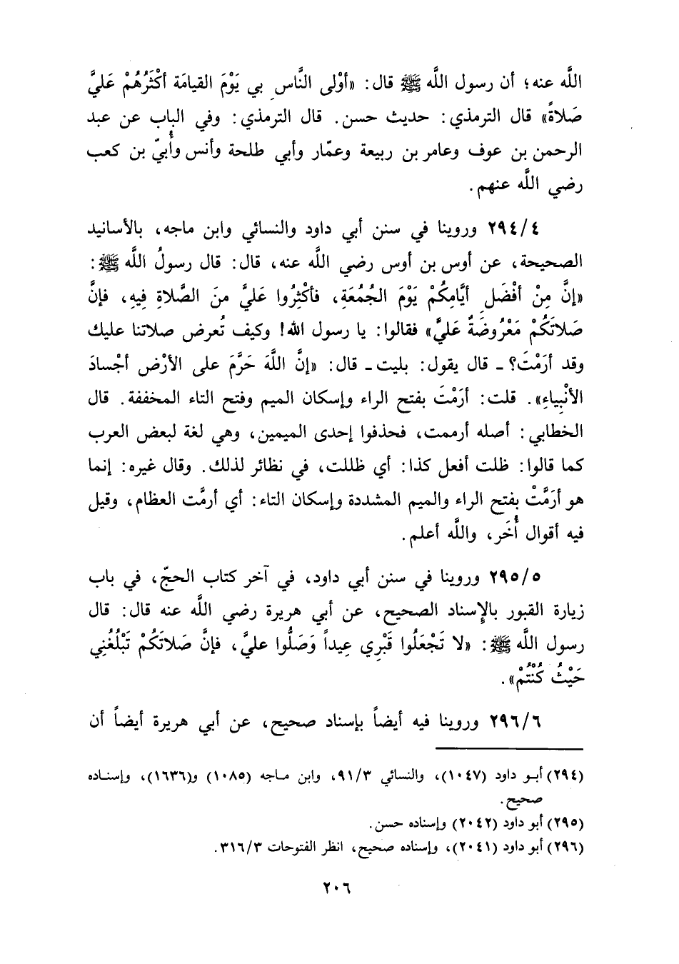 قال رسولُ الله صلى الله عليه وسلم: "إِنَّ مِنْ أفْضَلِ أيَّامِكُمْ يَوْمَ الجُمُعَةِ، فأكْثِرُا عَليَّ مِنَ الصَّلاةِ فِيهِ، فإنَّ صَلاتَكُمْ مَعْرُوضَةٌ عَليَّ" فقالوا: يا رسول الله! وكيف تُعرض صلاتنا عليك وقد أرَمْتَ؟ ـ قال: يقول: بليت ـ قال: "إنَّ الله حَرَّمَ على الأرض أجْسادَ الأنْبِياءِ". قلت: أرَمْتَ بفتح الراء وإسكان الميم وفتح التاء المخففة. قال الخطابي: أصله أرممت، فحذفوا إحدى الميمين، وهي لغة لبعض العرب كما قالوا: ظلت أفعل كذا: أي ظللت، في نظائر لذلك. وقال غيره: إنما هو أرَمَّتْ بفتح الراء والميم المشددة وإسكان التاء: أي أرمَّت العظام، وقيل فيه أقوال أُخَر، والله أعلم.