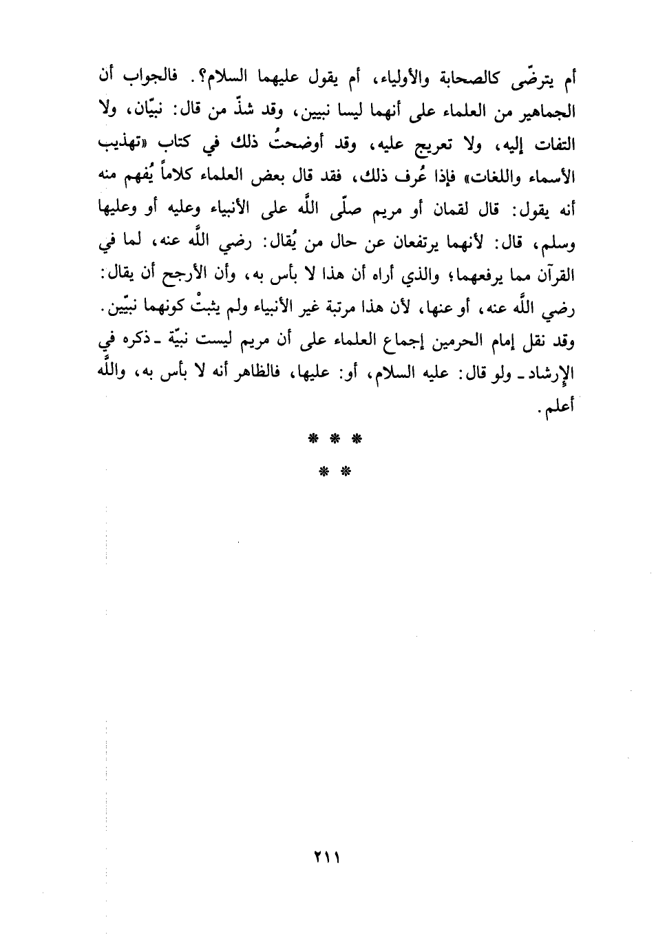 أم يترضّى كالصحابة والأولياء، أم يقول عليهما السلام؟. فالجواب أن الجماهير من العلماء على أنهما ليسا نبيين، وقد شذّ من قال: نبيّان، ولا التفات إليه، ولا تعريج عليه، وقد أوضحتُ ذلك في كتاب "تهذيب الأسماء واللغات" فإذا عُرف ذلك، فقد قال بعض العلماء كلامًا يُفهم منه أنه يقول: قال لقمان أو مريم صلَّى الله على الأنبياء وعليه أو وعليها وسلم، قال: لأنهما يرتفعان عن حال من يُقال: رضي الله عنه، لما في القرآن مما يرفعهما؛ والذي أراه أن هذا لا بأس به، وأن الأرجح أن يقال: رضي الله عنه، أو عنها، لأن هذا مرتبة غير الأنبياء ولم يثبتْ كونهما نبيّين. وقد نقل إمام الحرمين إجماع العلماء على أن مريم ليست نبيّة ـ ذكره في الإِرشاد ـ ولو قال: عليه السلام، أو: عليها، فالظاهر أنه لا بأس به، والله أعلم.