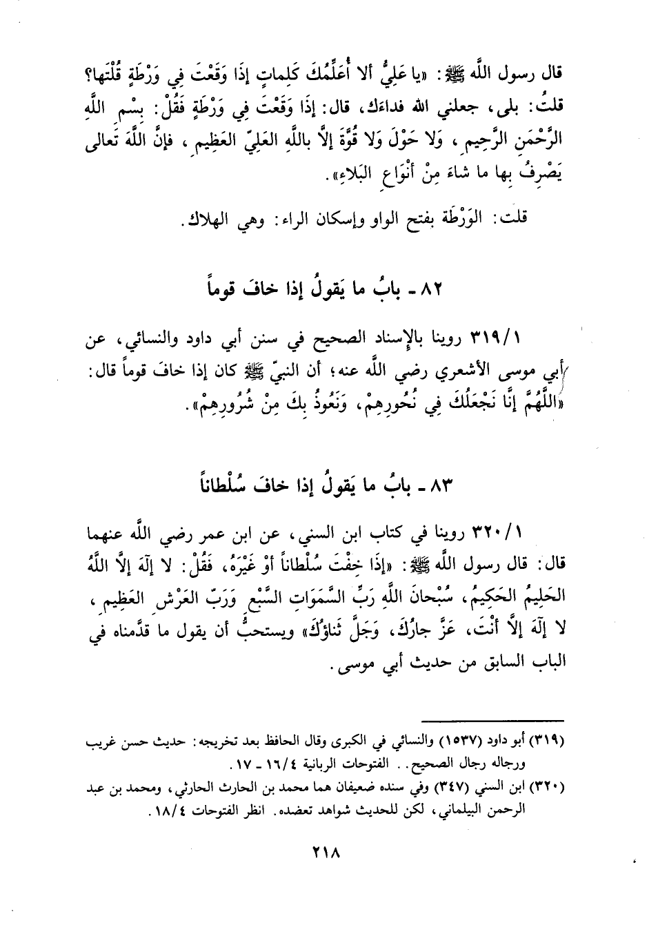 قال رسول الله صلى الله عليه وسلم: "إذَا خِفْتَ سُلْطانًا أوْ غَيْرَهُ، فَقُلْ: لا إِلهَ إِلاَّ اللَّهُ الحَلِيمُ الحَكِيمُ، سُبْحانَ اللَّهِ رَبِّ السَّمَوَاتِ السَّبْعِ وَرَبّ العَرْشِ العَظِيمِ، لا إِلهَ إِلاَّ أنْتَ، عَزَّ جارُكَ، وَجَلَّ ثَناؤُكَ" ويستحبُّ أن يقول ما قدَّمناه في الباب السابق من حديث أبي موسى.