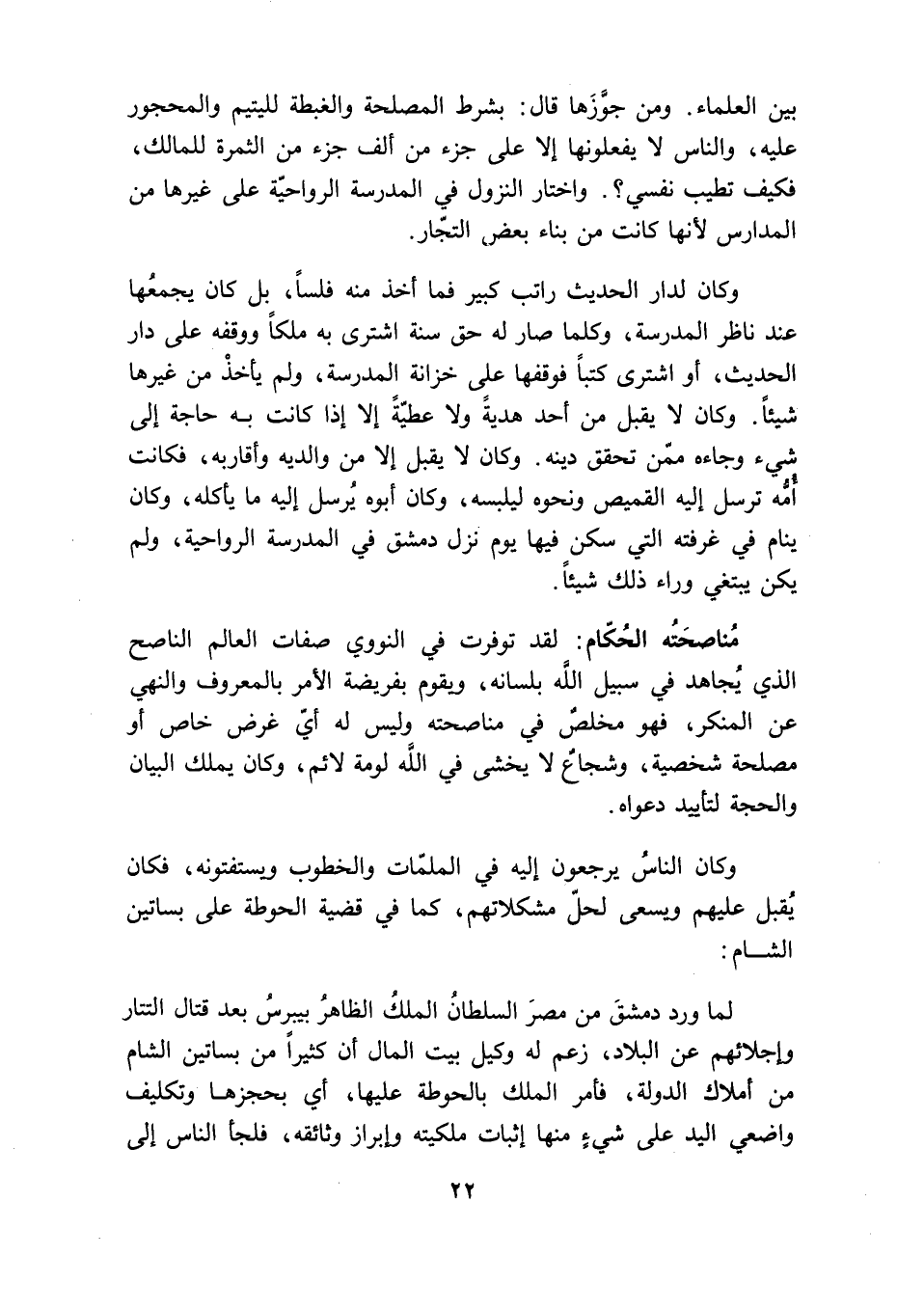 لقد توفرت في النووي صفات العالم الناصح الذي يُجاهد في سبيل الله بلسانه، ويقوم بفريضة الأمر بالمعروف والنهي عن المنكر، فهو مخلصٌ في مناصحته وليس له أيّ غرض خاص أو مصلحة شخصية، وشجاعٌ لا يخشى في اللَّه لومة لائم، وكان يملك البيان والحجة لتأييد دعواه.