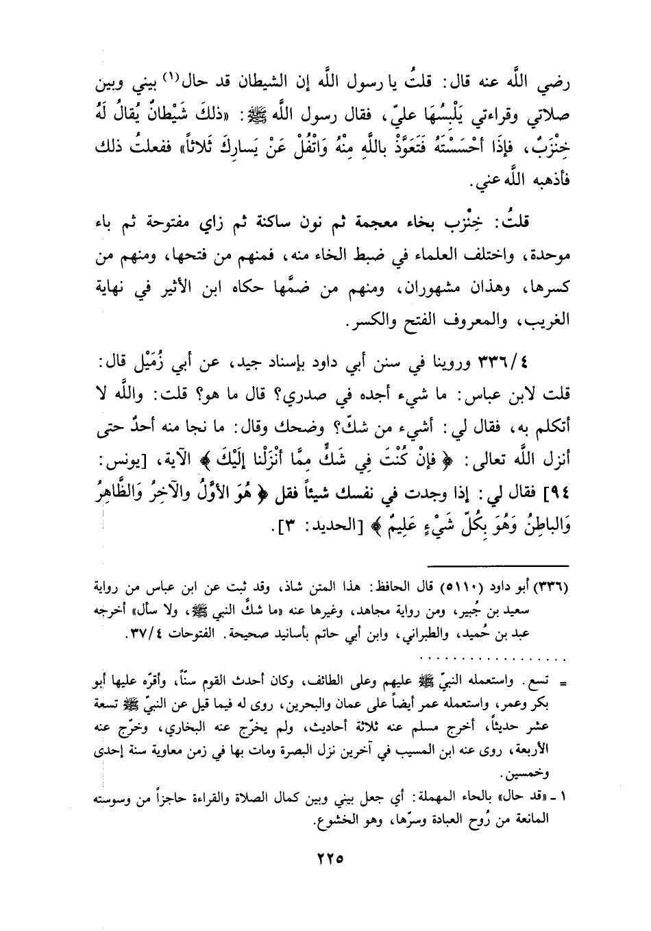 قلتُ يا رسول الله إن الشيطان قد حال (¬1) بيني وبين صلاتي وقراءتي يَلْبِسُهَا عليّ، فقال رسول الله صلى الله عليه وسلم: "ذلكَ شَيْطانٌ يُقالُ لَهُ خِنْزَبٌ، فإذَا أحْسَسْتَهُ فَتَعَوَّذْ باللَّهِ مِنْهُ وَاتْفُلْ عَنْ يَسارِكَ ثَلاثًا" ففعلتُ ذلك فأذهبه الله عنه.
