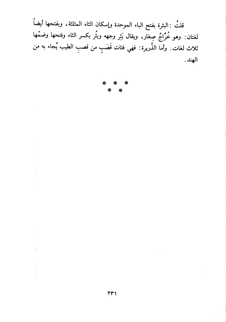قلتُ: البثرة بفتح الباء الموحدة وإسكان الثاء المثلثة، وبفتحها أيضًا لغتان: وهو خُرَّاجٌ صِغار، ويقال بَثِر وجهه وبثر بكسر الثاء وفتحها وضمّها ثلاث لغات. وأما الذَّريرة: فهي فتات قَصَبٍ من قصبِ الطيب يُجاء به من الهند.