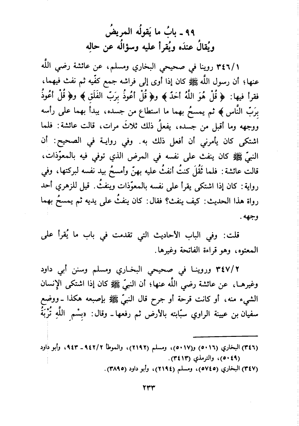 99 ـ بابُ ما يَقولُه المريضُ ويُقالُ عندَه ويُقرأ عليه وسؤالُه عن حالِه