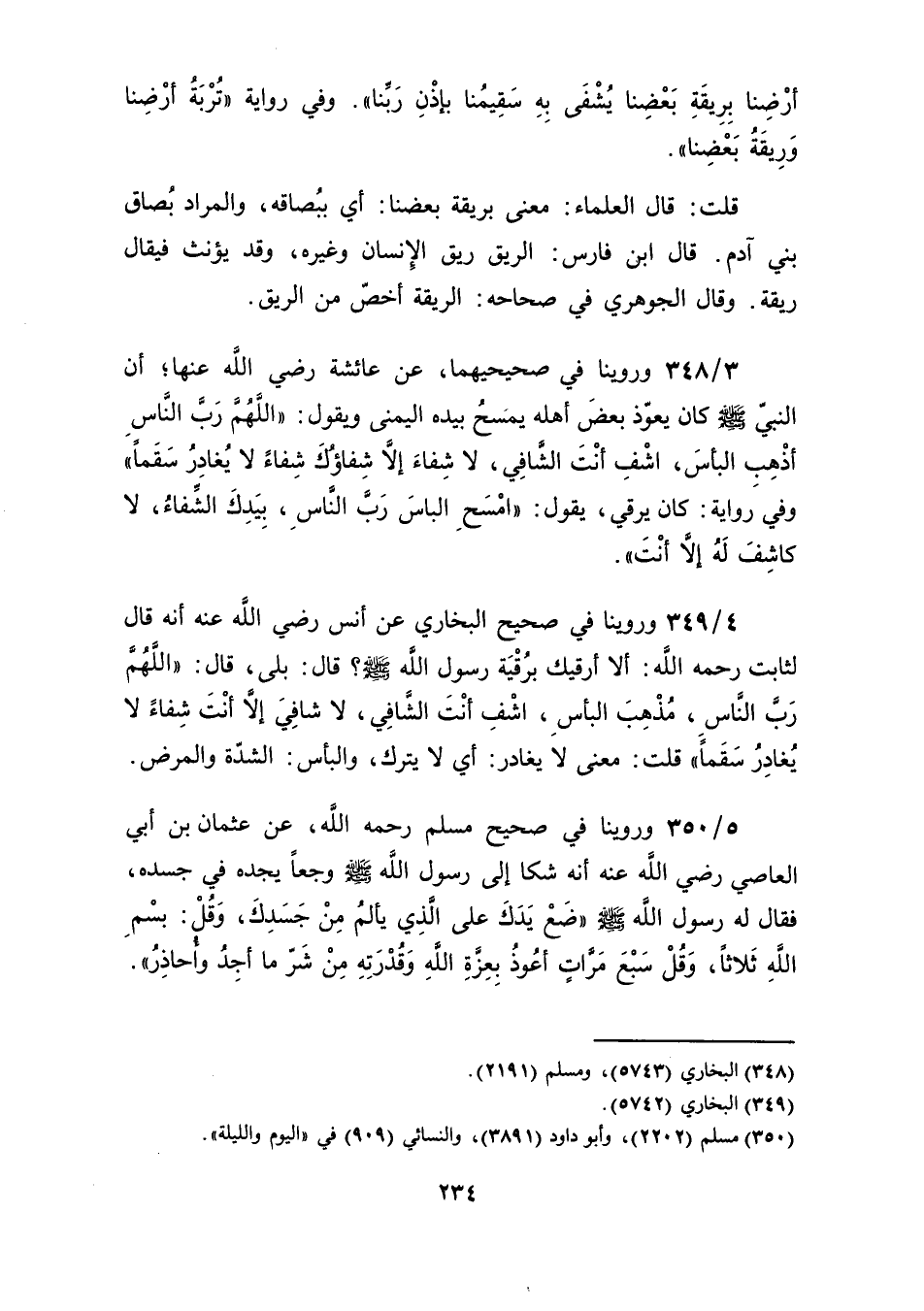 أرْضِنا بِرِيقَةِ بَعْضِنا يُشْفَى بِهِ سَقِيمُنا بإذْنِ رَبِّنا". وفي رواية: "تُرْبَةُ أرْضِنا وَرِيقَةُ بَعْضِنا".