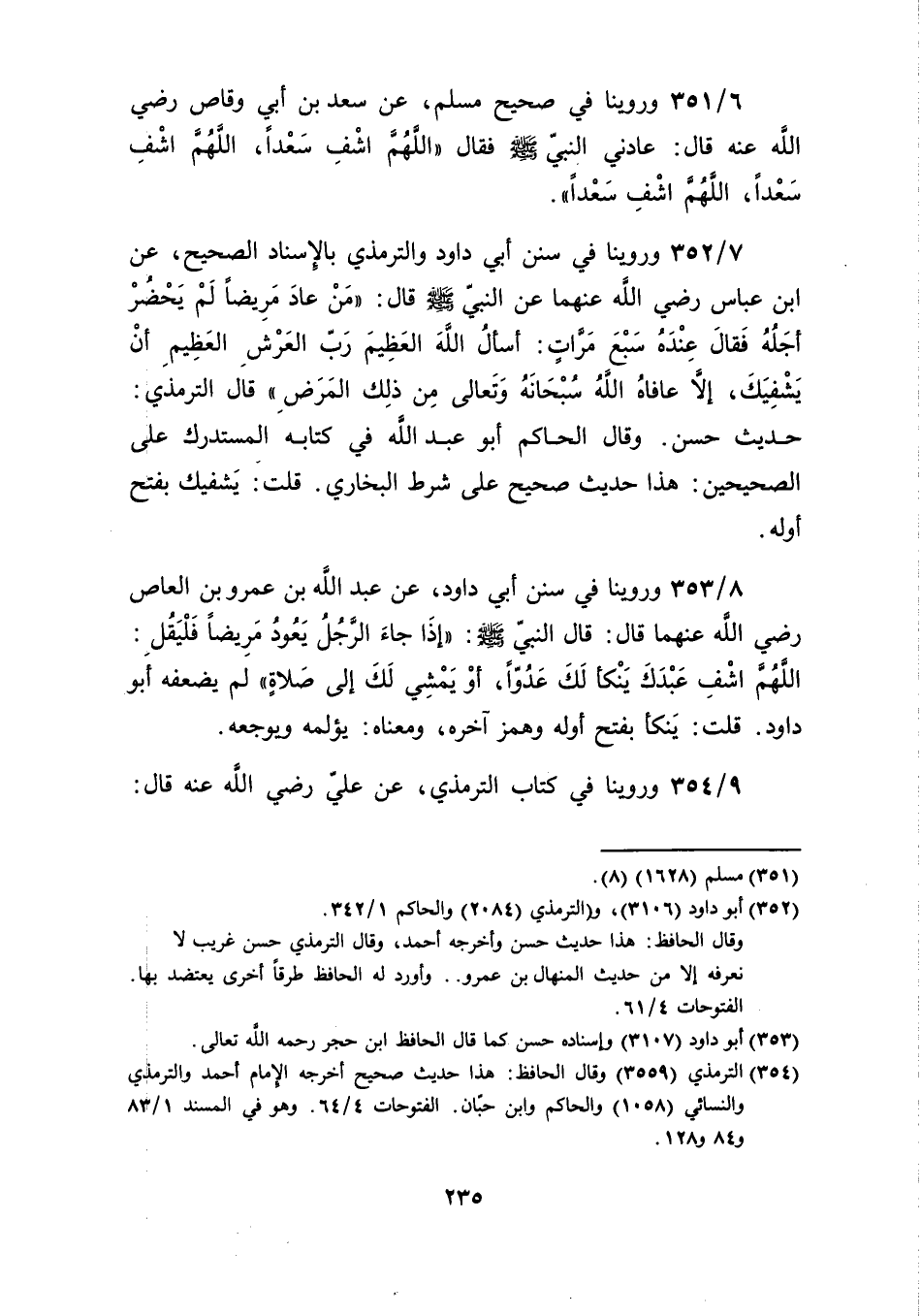 عن النبيّ صلى الله عليه وسلم قال: "مَنْ عادَ مَرِيضًا لَمْ يَحْضُرْ أجَلُهُ فَقالَ عِنْدَهُ سَبْعَ مَرَّاتٍ: أسألُ اللَّهَ العَظِيمَ رَبّ العَرْشِ العَظِيمِ أنْ يَشْفِيكَ، إلاَّ عافاهُ اللَّهُ سُبْحَانَهُ وَتَعالى مِن ذلِك المَرَضِ" قال الترمذي: حديث حسن. وقال الحاكم أبو عبد الله في كتابه المستدرك على الصحيحين: هذا حديث صحيح على شرط البخاري. قلت: يَشفيك بفتح أوله.