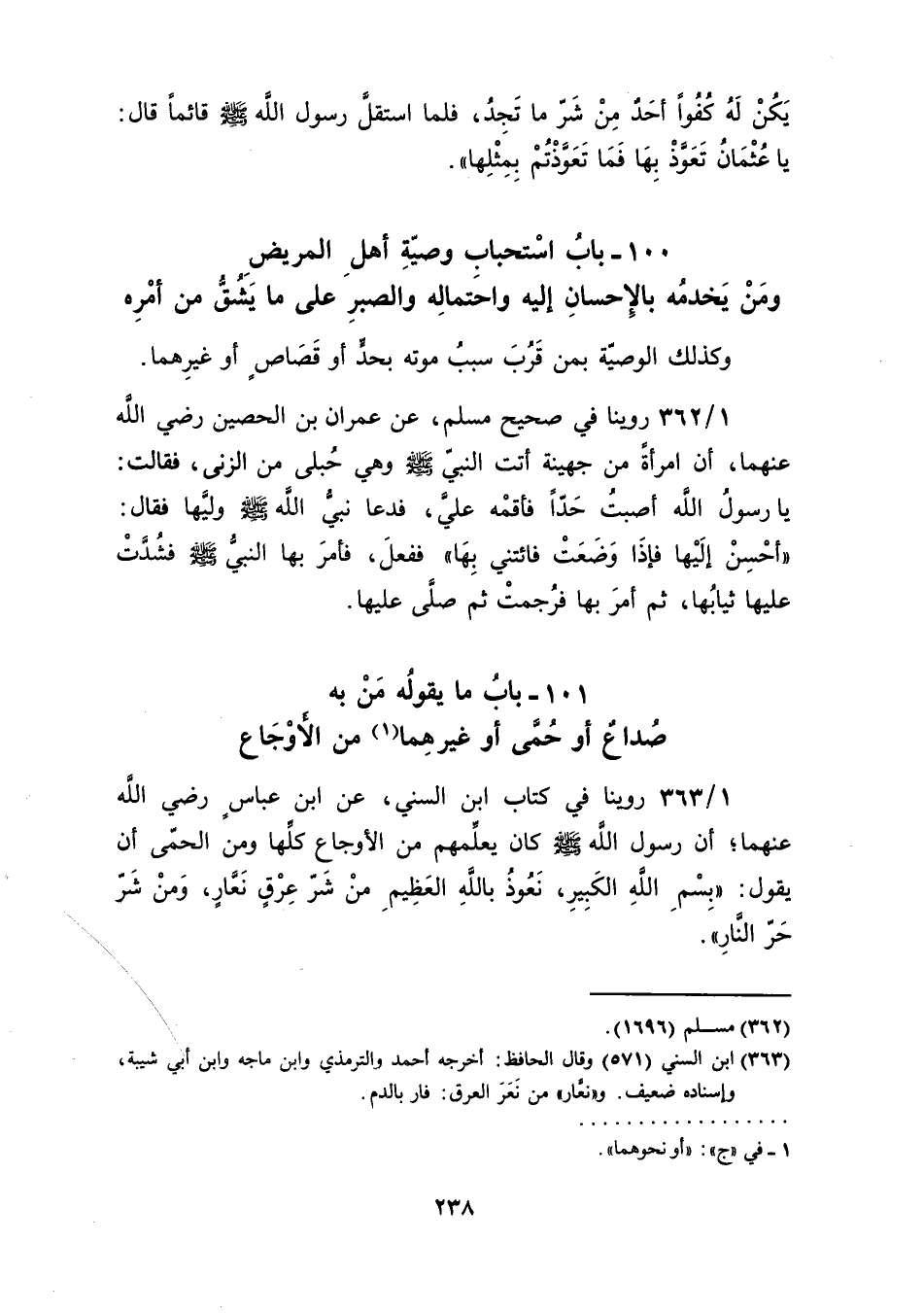101 ـ بابُ ما يقولُه مَنْ به صُداعٌ أو حُمَّى أو غيرهِما (¬1) من الأَوْجَاع