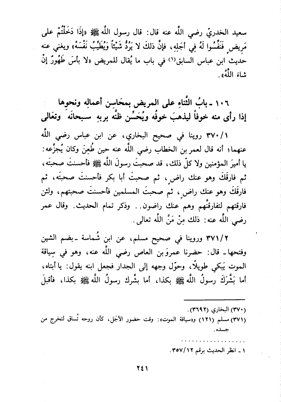 106 ـ بابُ الثَّناءِ على المريضِ بمحَاسِن أعمالِه ونحوها إذا رأى منه خوفًا ليذهبَ خوفُه ويُحَسِّن ظنَّه بربهِ سبحانَه وتعَالى