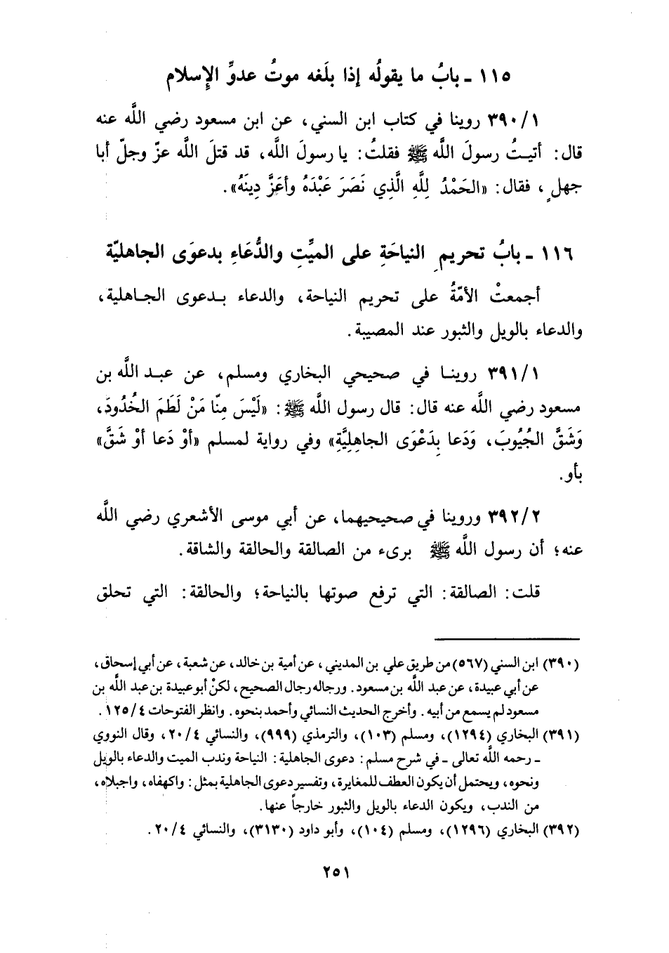 [391] البخاري (1294)، ومسلم (103)، والترمذي (999)، والنسائي 4/ 20، وقال النووي ـ رحمه الله تعالى ـ في شرح مسلم: دعوى الجاهلية: النياحة وندب الميت والدعاء بالويل ونحوه، ويحتمل أن يكون العطف للمغايرة، وتفسير دعوى الجاهلية بمثل: واكهفاه، واجبلاه، من الندب، ويكون الدعاء بالويل والثبور خارجًا عنها.
