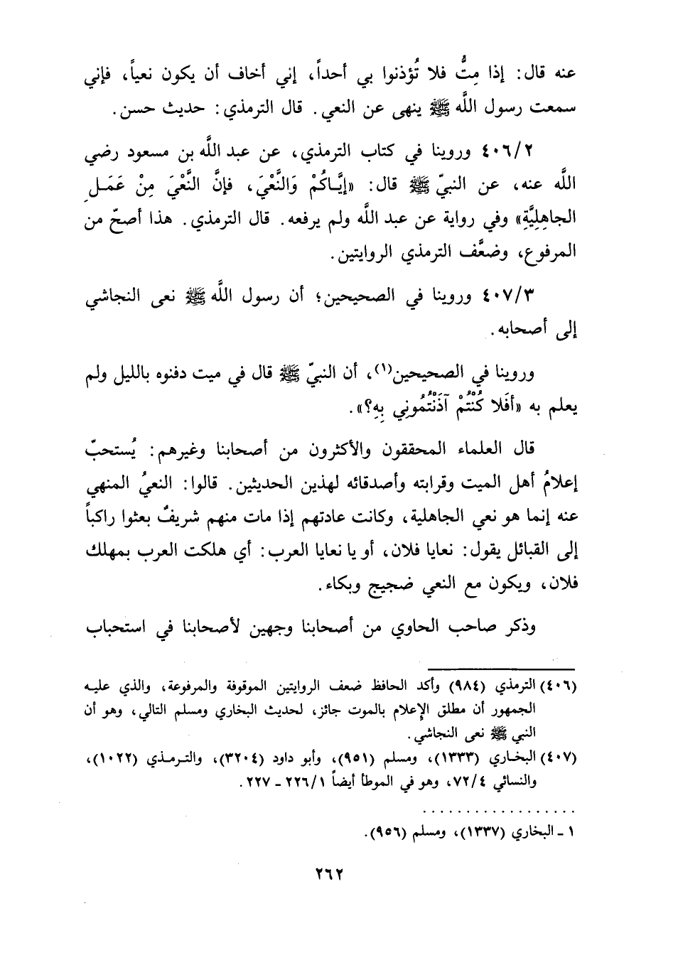 [406] الترمذي (984) وأكد الحافظ ضعف الروايتين الموقوفة والمرفوعة، والذي عليه الجمهور أن مطلق الإِعلام بالموت جائز، لحديث البخاري ومسلم التالي، وهو أن النبي صلى الله عليه وسلم نعى النجاشي.