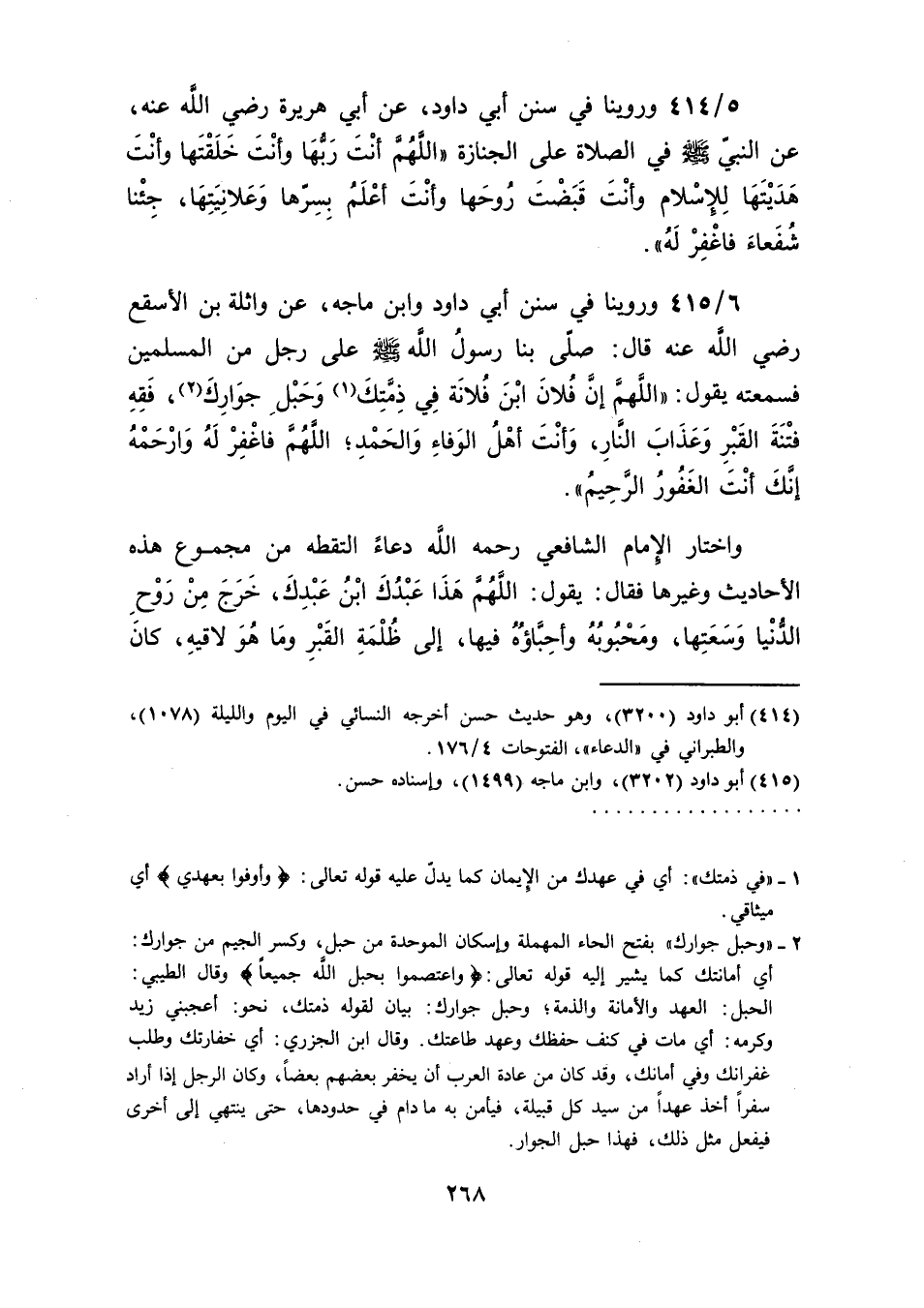 واختار الإِمام الشافعي رحمه الله دعاءً التقطه من مجموع هذه الأحاديث وغيرها فقال: يقول: اللَّهُمَّ هَذَا عَبْدُكَ ابْنُ عَبْدِكَ، خَرَجَ مِنْ رَوْحِ الدُّنْيا وَسَعَتِها، ومَحْبُوبُهُ وأحِبَّاؤُهُ فيها، إلى ظُلْمَةِ القَبْرِ ومَا هُوَ لاقيهِ، كانَ