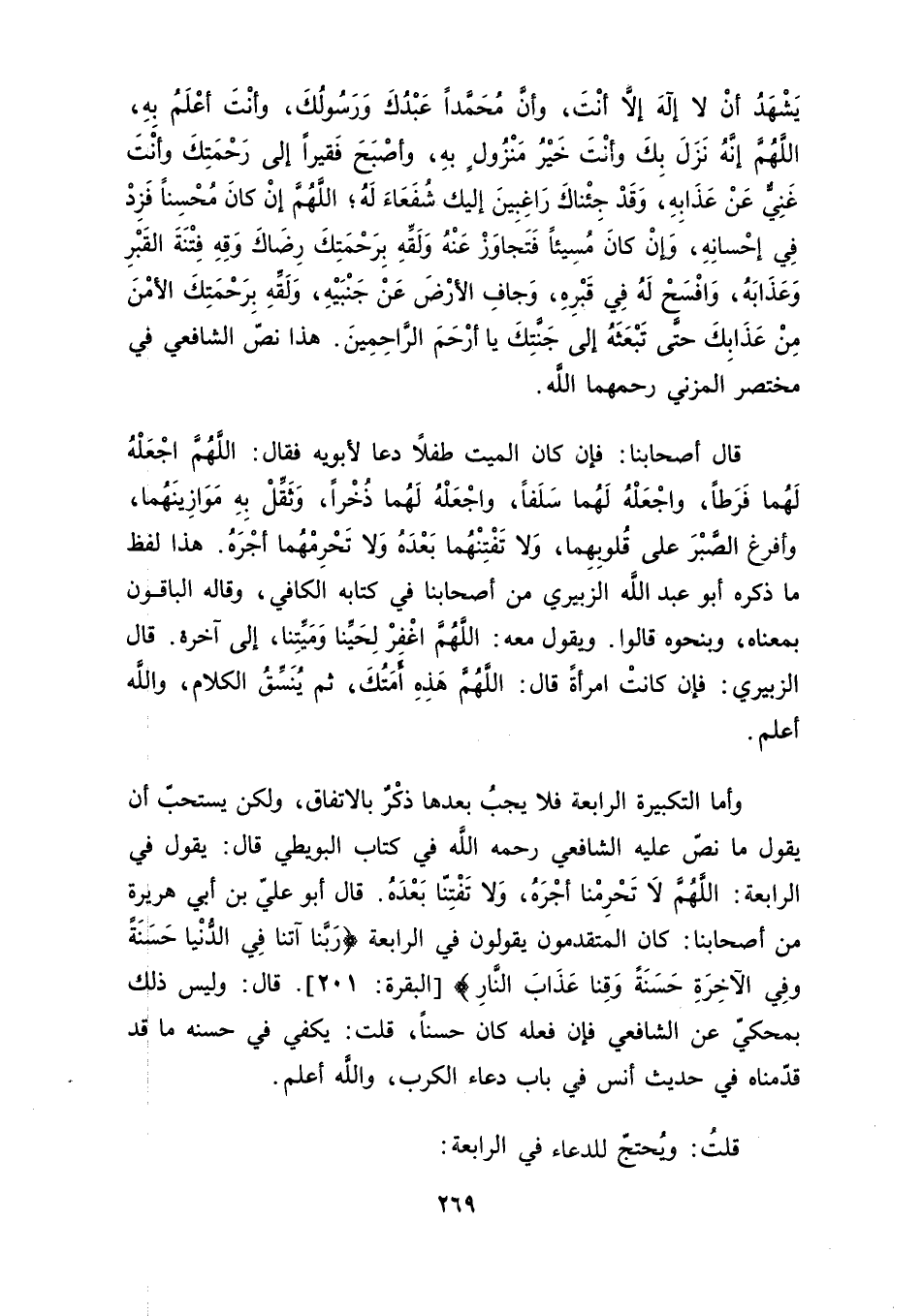 يَشْهَدُ أنْ لا إِلهَ إِلاَّ أنْتَ، وأنَّ مُحَمَّدًا عَبْدُكَ وَرَسُولُكَ، وأنْتَ أعْلَمُ بِهِ، اللَّهُمَّ إنَّهُ نَزَلَ بِكَ وأنْتَ خَيْرُ مَنْزُولٍ به، وأصْبَحَ فَقيرًا إلى رَحْمَتِكَ وأنْتَ غَنِيٌّ عَنْ عَذَابِهِ، وَقَدْ جِئْنَاكَ رَاغِبِينَ إليك شُفَعَاءَ لَهُ؛ اللَّهُمَّ إنْ كَانَ مُحْسِنًا فَزِدْ في إِحْسَانِهِ، وَإِنْ كَانَ مُسِيئًا فَتَجاوَزْ عَنْهُ وَلَقِّهِ بِرَحْمَتِكَ رِضَاكَ وَقِهِ فِتْنَةَ القَبْرِ وَعَذَابَهُ، وَافْسحْ لَهُ في قَبْرِهِ، وَجافِ الأرْضَ عَنْ جَنْبَيْهِ، وَلَقِّهِ بِرَحْمَتِكَ الأمْنَ مِنْ عَذَابِكَ حتَّى تَبْعَثَهُ إلى جَنَّتِكَ يا أرْحَمَ الرَّاحِمِينَ! هذا نصّ الشافعي في مختصر المزني رحمهما الله.