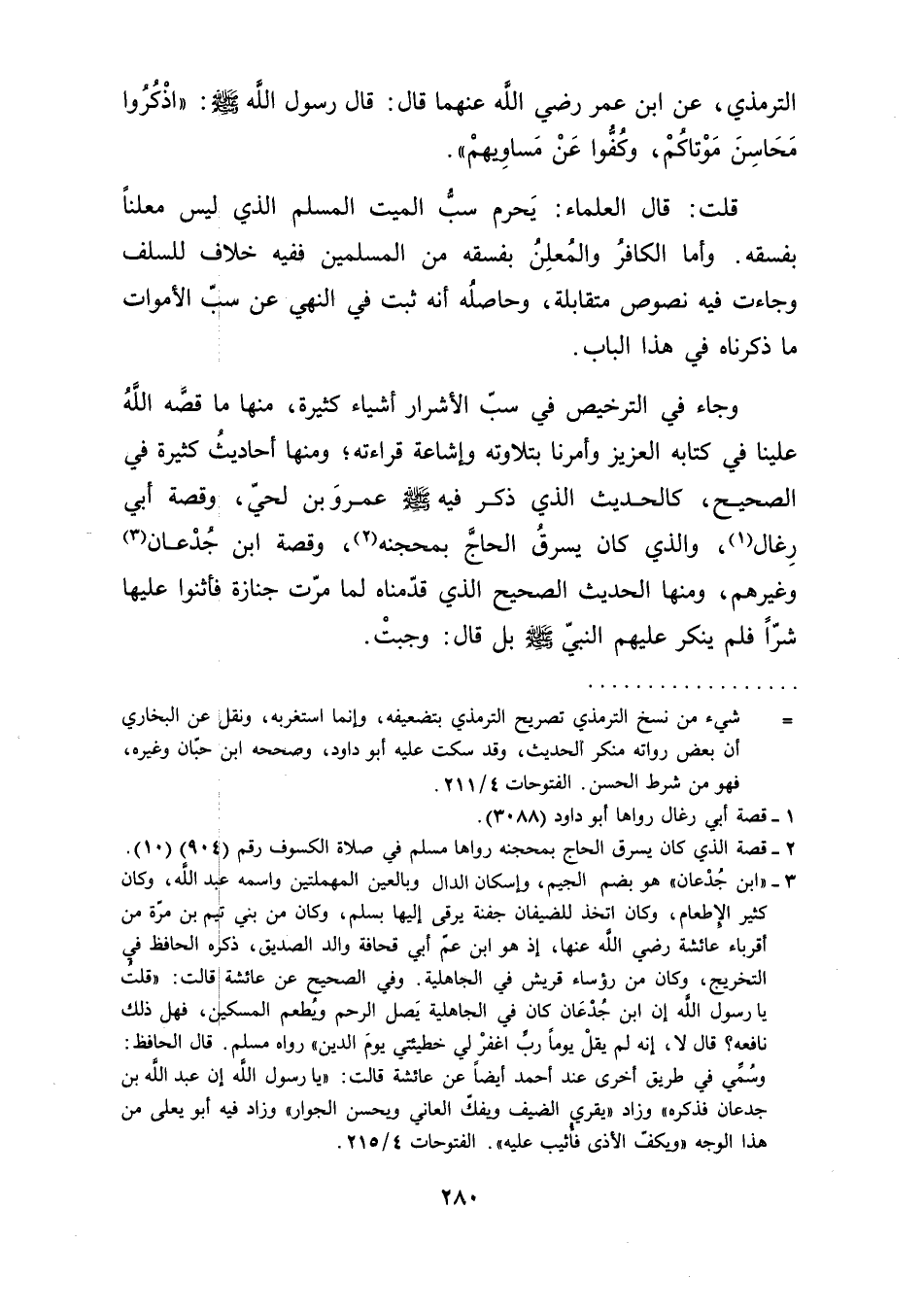 قلت: قال العلماء: يَحرم سبُّ الميت المسلم الذي ليس معلنًا بفسقه. وأما الكافرُ والمُعلِنُ بفسقه من المسلمين ففيه خلاف للسلف وجاءت فيه نصوص متقابلة، وحاصلُه أنه ثبت في النهي عن سبّ الأموات ما ذكرناه في هذا الباب.