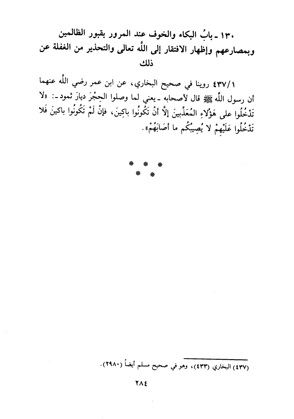 130 ـ بابُ البكاء والخوف عند المرور بقبور الظالمين وبمصارعهم وإظهار الافتقار إلى الله تعالى والتحذير من الغفلة عن ذلك