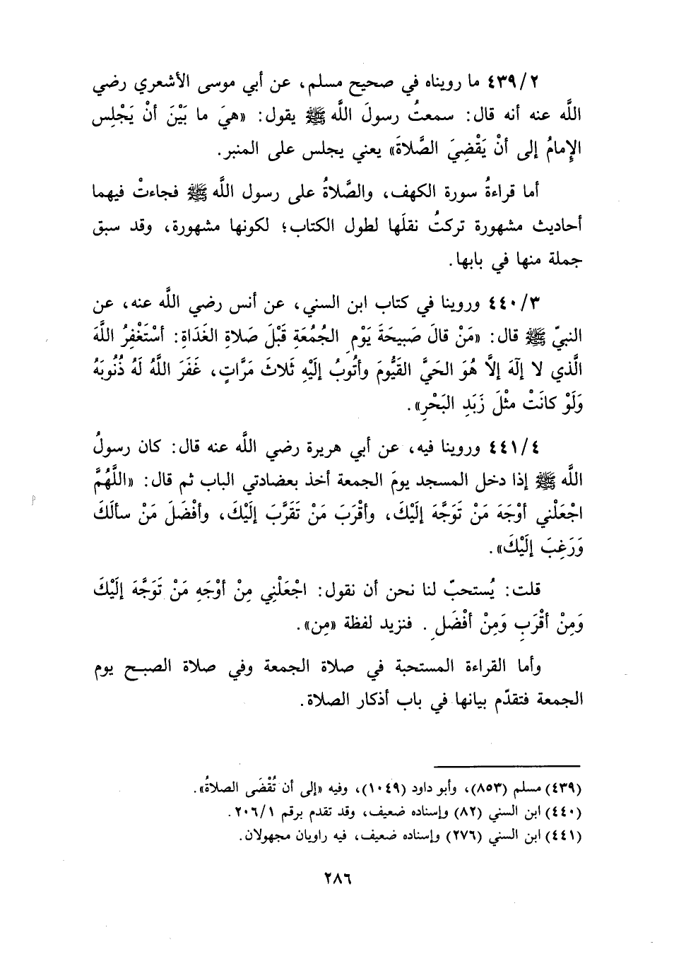 وأما القراءة المستحبة في صلاة الجمعة وفي صلاة الصبح يوم الجمعة فتقدّم بيانها في باب أذكار الصلاة.