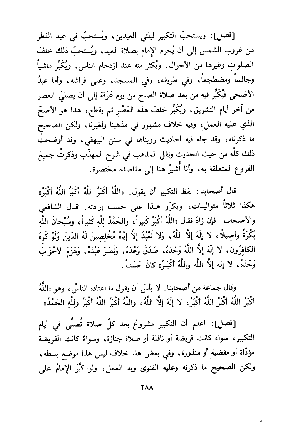 [فصل]: ويستحبّ التكبير ليلتي العيدين، ويُستحبّ في عيد الفطر من غروب الشمس إلى أن يُحرم الإِمام بصلاة العيد، ويُستحبّ ذلك خلفَ الصلواتِ وغيرها من الأحوال. ويُكثر منه عند ازدحام الناس، ويُكَبِّر ماشيًا وجالسًا ومضطجعًا، وفي طريقه، وفي المسجد، وعلى فراشه، وأما عيدُ الأضحى فيُكَبِّر فيه من بعد صلاة الصبح من يوم عَرَفة إلى أن يصليَ العصر من آخر أيام التشريق، وَيُكَبِّر خلفَ هذه العَصْرِ ثم يقطع، هذا هو الأصحّ الذي عليه العمل، وفيه خلاف مشهور في مذهبنا ولغيرنا، ولكن الصحيح ما ذكرناه، وقد جاء فيه أحاديث رويناها في سنن البيهقي، وقد أوضحتُ ذلك كلَّه من حيث الحديث ونقل المذهب في شرح المهذّب وذكرتُ جميعَ الفروع المتعلقة به، وأنا أُشيرُ هنا إلى مقاصده مختصرة.
