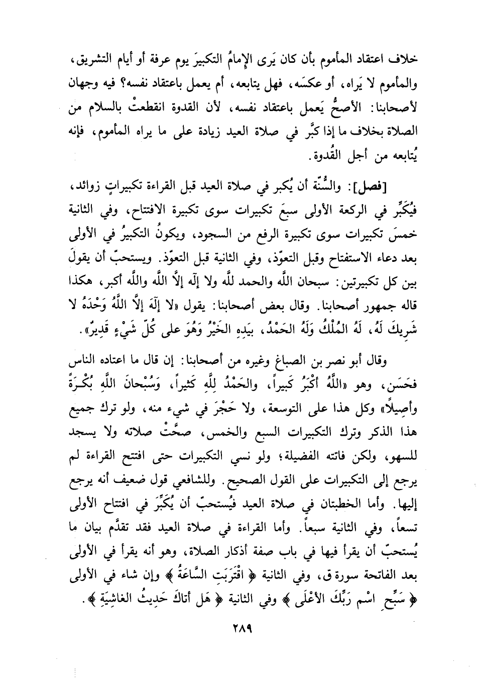 وقال أبو نصر بن الصباغ وغيره من أصحابنا: إن قال ما اعتاده الناس فحَسَن، وهو "اللَّهُ أكْبَرُ كَبيرًا، والحَمْدُ لِلَّهِ كَثِيرًا، وَسُبْحانَ اللَّهِ بُكْرَةً وأصِيلًا" وكل هذا على التوسعة، ولا حَجْرَ في شيء منه، ولو ترك جميع هذا الذكر وترك التكبيرات السبع والخمس، صحَّتْ صلاته ولا يسجد للسهو، ولكن فاتته الفضيلة؛ ولو نسي التكبيرات حتى افتتح القراءة لم يرجع إلى التكبيرات على القول الصحيح. وللشافعي قول ضعيف أنه يرجع إليها. وأما الخطبتان في صلاة العيد فيُستحبّ أن يُكَبِّرَ في افتتاح الأولى تسعًا، وفي الثانية سبعًا. وأما القراءة في صلاة العيد فقد تقدَّم بيان ما يُستحبّ أن يقرأ فيها في باب صفة أذكار الصلاة، وهو أنه يقرأ في الأولى بعد الفاتحة سورة ق، وفي الثانية {اقْتَرَبَتِ السَّاعَةُ} وإن شاء في الأولى {سَبِّحِ اسْم رَبِّكَ الأعْلَى} وفي الثانية {هَل أتاكَ حَدِيثُ الغاشِيَةِ}.