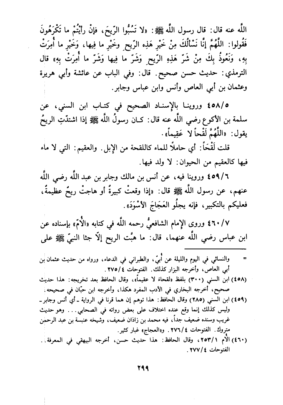 قال رسول الله صلى الله عليه وسلم: "لا تَسُبُّوا الرّيحَ، فإنْ رأيْتُمْ ما تَكْرَهُونَ فَقُولوا: اللَّهُمَّ إنَّا نَسْألُكَ مِنْ خَيْرِ هَذِهِ الرّيحِ وخَيْرِ ما فِيها، وَخَيْرِ ما أُمِرَتْ بِهِ، وَنَعُوذُ بِكَ مِنْ شَرّ هَذِهِ الرّيحِ وَشَرّ ما فِيها وَشَرّ ما أُمِرَتْ بِهِ" قال الترمذي: حديث حسن صحيح. قال: وفي الباب عن عائشة وأبي هريرة وعثمان بن أبي العاص وأنس وابن عباس وجابر.