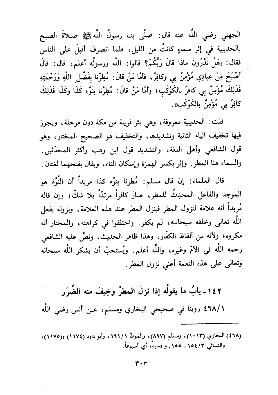 قال العلماء: إن قال مسلم: مُطرنا بنوْء كذا مريدًا أن النَّوْءَ هو الموجد والفاعل المحدِثُ للمطر، صارَ كافرًا مرتدًّا بلا شكّ؛ وإن قاله مُريدًا أنه علامة لنزول المطر فينزل المطر عند هذه العلامة، ونزوله بفعل الله تعالى وخلقه سبحانه، لم يكفر. واختلفوا في كراهته، والمختار أنه مكروه؛ ولأنه من ألفاظ الكفّار، وهذا ظاهر الحديث، ونصَّ عليه الشافعي رحمه الله في الأمّ وغيره، والله أعلم. ويُستحبّ أن يشكر الله سبحانه وتعالى على هذه النعمة أعني نزول المطر.