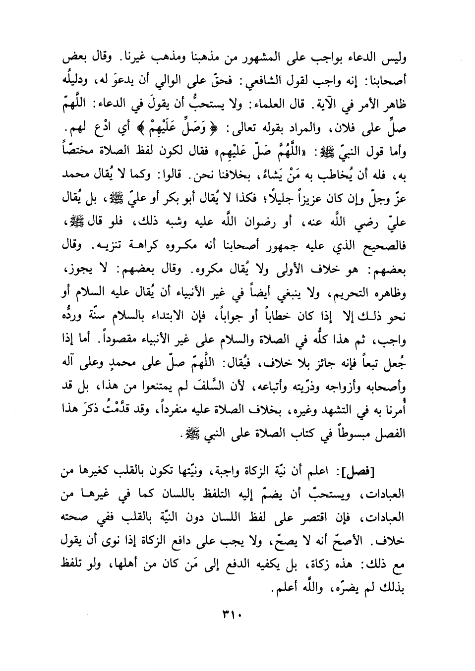 وليس الدعاء بواجب على المشهور من مذهبنا ومذهب غيرنا. وقال بعض أصحابنا: إنه واجب لقول الشافعي: فحقّ على الوالي أن يدعوَ له، ودليلُه ظاهر الأمر في الآية. قال العلماء: ولا يستحبُّ أن يقولَ في الدعاء: اللَّهُمّ صلِّ على فلان، والمراد بقوله تعالى: {وَصَلِّ عَلَيْهِمْ} أي ادْع لهم. وأما قول النبيّ صلى الله عليه وسلم: "اللَّهُمَّ صَلّ عَلْيهِم" فقال لكون لفظ الصلاة مختصًّا به، فله أن يُخاطب به مَنْ يَشاءُ، بخلافنا نحن. قالوا: وكما لا يُقال محمد عزّ وجلّ وإن كان عزيزًا جليلًا؛ فكذا لا يُقال أبو بكر أو عليّ صلى الله عليه وسلم، بل يُقال عليّ رضي الله عنه، أو رضوان الله عليه وشبه ذلك، فلو قال صلى الله عليه وسلم، فالصحيح الذي عليه جمهور أصحابنا أنه مكروه كراهة تنزيه. وقال بعضهم: هو خلاف الأولى ولا يُقال مكروه. وقال بعضهم: لا يجوز، وظاهره التحريم، ولا ينبغي أيضًا في غير الأنبياء أن يُقال عليه السلام أو نحو ذلك إلا إذا كان خطابًا أو جوابًا، فإن الابتداء بالسلام سنّة وردُّه واجب، ثم هذا كلُّه في الصلاة والسلام على غير الأنبياء مقصودًا. أما إذا جُعل تبعًا فإنه جائز بلا خلاف، فيُقال: اللَّهمّ صلّ على محمدٍ وعلى آله وأصحابه وأزواجه وذرّيته وأتباعه، لأن السَّلفَ لم يمتنعوا من هذا، بل قد أُمرنا به في التشهد وغيره، بخلاف الصلاة عليه منفردًا، وقد قدَّمْتُ ذكرَ هذا الفصل مبسوطًا في كتاب الصلاة على النبي صلى الله عليه وسلم.
