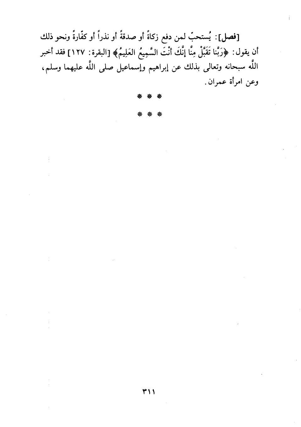 [فصل]: يُستحبّ لمن دفع زكاةً أو صدقةً أو نذرًا أو كفّارةً ونحو ذلك أن يقول: {رَبَّنا تَقَبَّلْ مِنَّا إنَّكَ أنْتَ السَّمِيعُ العَلِيمُ} [البقرة:127] فقد أخبر الله سبحانه وتعالى بذلك عن إبراهيم وإسماعيل صلى الله عليهما وسلم، وعن امرأة عمران.