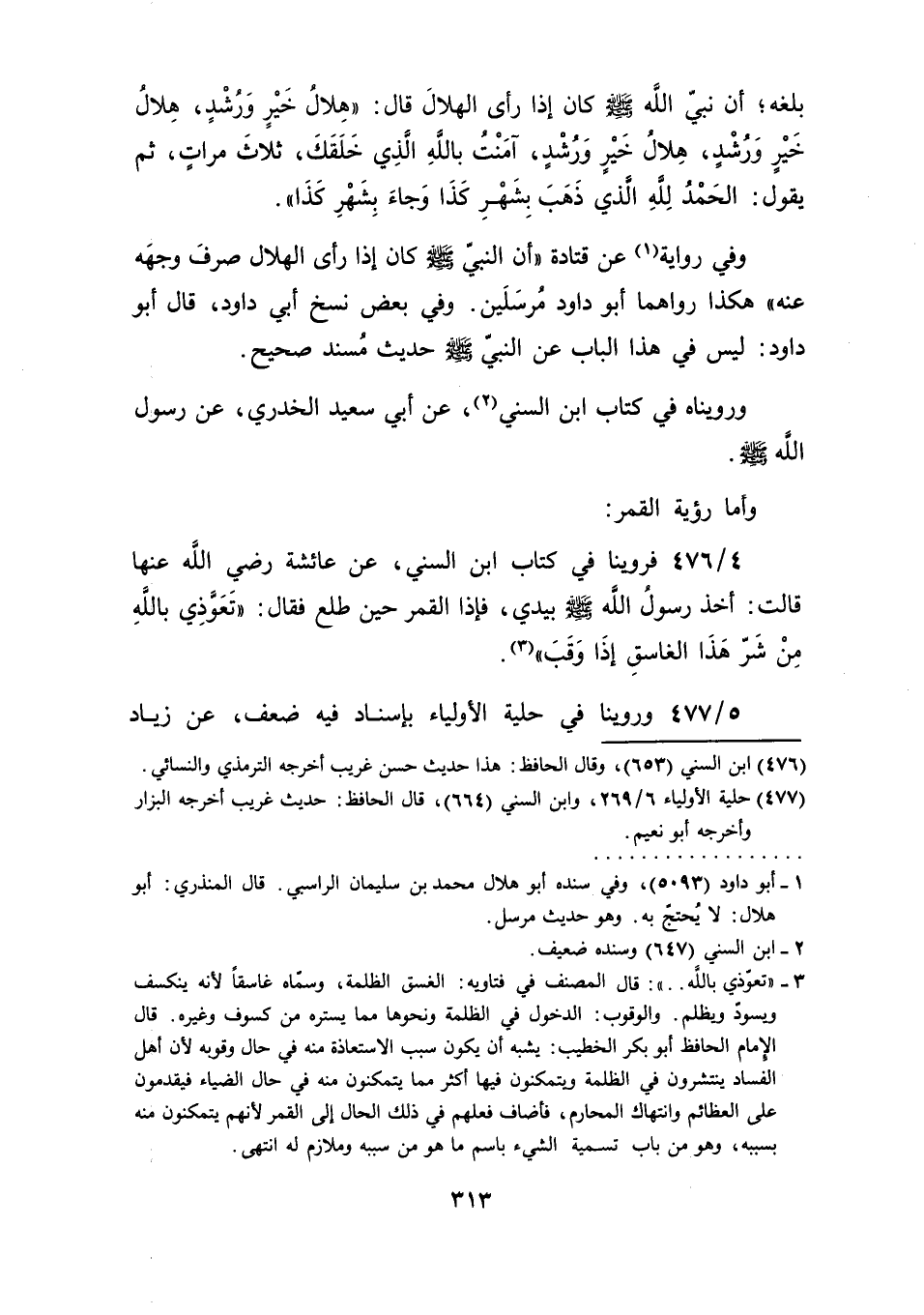 وفي رواية (¬1) عن قتادة "أن النبيّ صلى الله عليه وسلم كان إذا رأى الهلال صرف وجهَه عنه" هكذا رواهما أبو داود مُرسَلَين. وفي بعض نسخ أبي داود، قال أبو داود: ليس في هذا الباب عن النبيّ صلى الله عليه وسلم حديث مُسند صحيح.