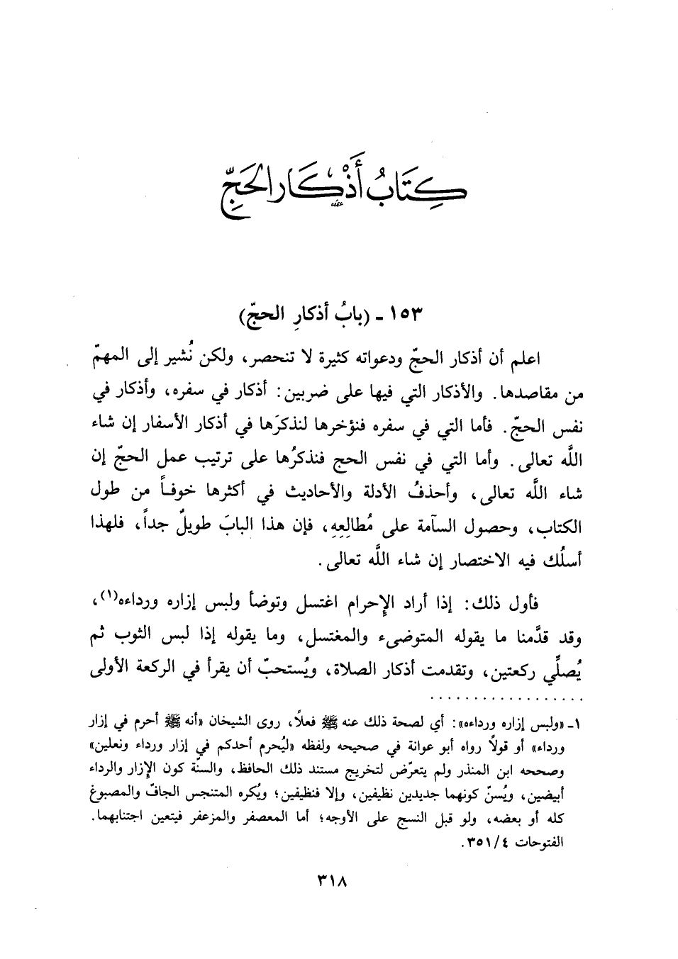 اعلم أن أذكار الحجّ ودعواته كثيرة لا تنحصر، ولكن نُشير إلى المهمّ من مقاصدها. والأذكار التي فيها على ضربين: أذكار في سفره، وأذكار في نفس الحجّ. فأما التي في سفره فنؤخرها لنذكرَها في أذكار الأسفار إن شاء الله تعالى. وأما التي في نفس الحج فنذكرُها على ترتيب عمل الحجّ إن شاء الله تعالى، وأحذفُ الأدلة والأحاديث في أكثرها خوفًا من طول الكتاب، وحصول السآمة على مُطالِعِهِ، فإن هذا البابَ طويلٌ جدًا، فلهذا أسلُك فيه الاختصار إن شاء الله تعالى.