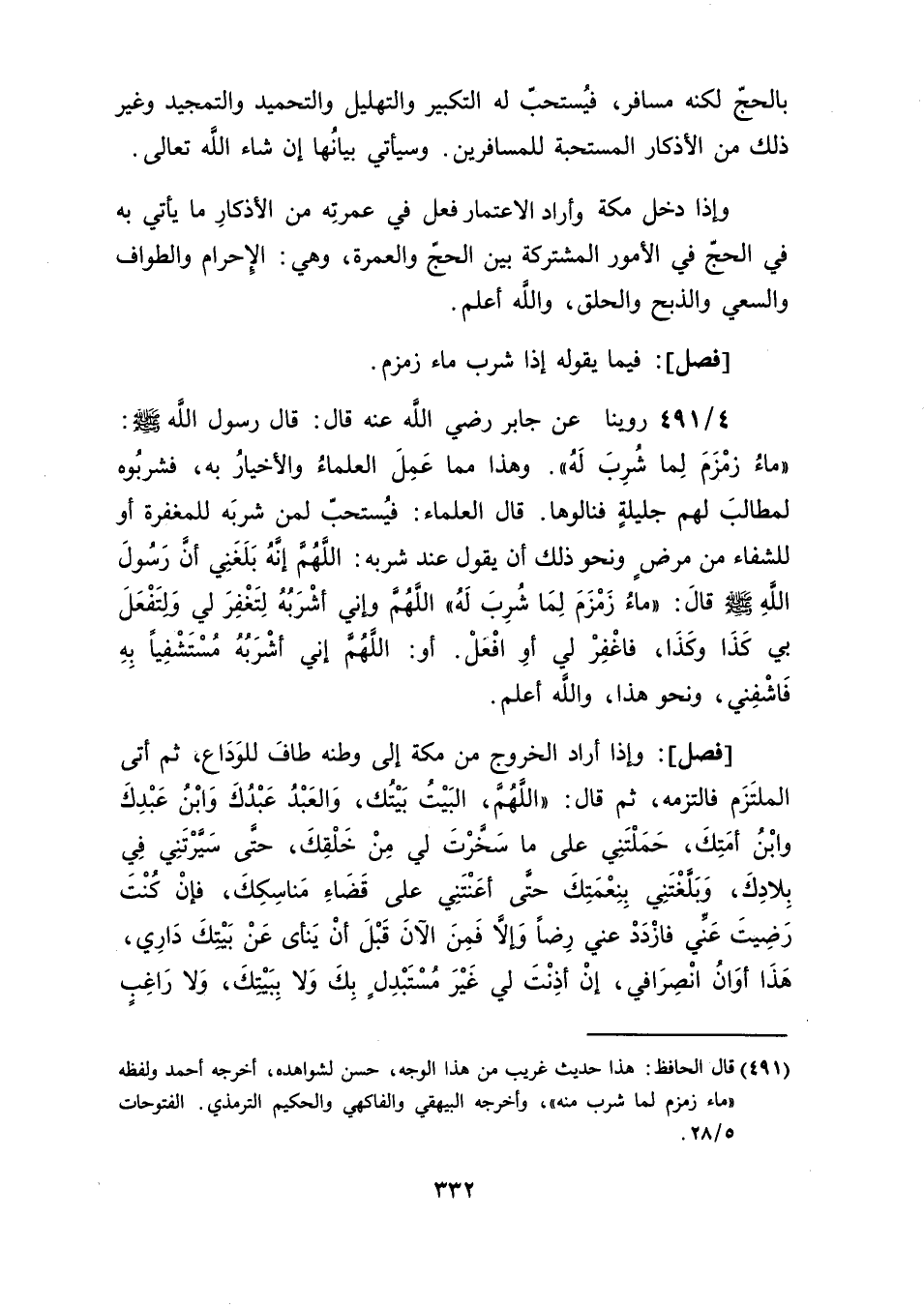 [491] قال الحافظ: هذا حديث غريب من هذا الوجه، حسن لشواهده، أخرجه أحمد ولفظه "ماء زمزم لما شرب منه"، وأخرجه البيهقي والفاكهي والحكيم الترمذي. الفتوحات 5/ 28.