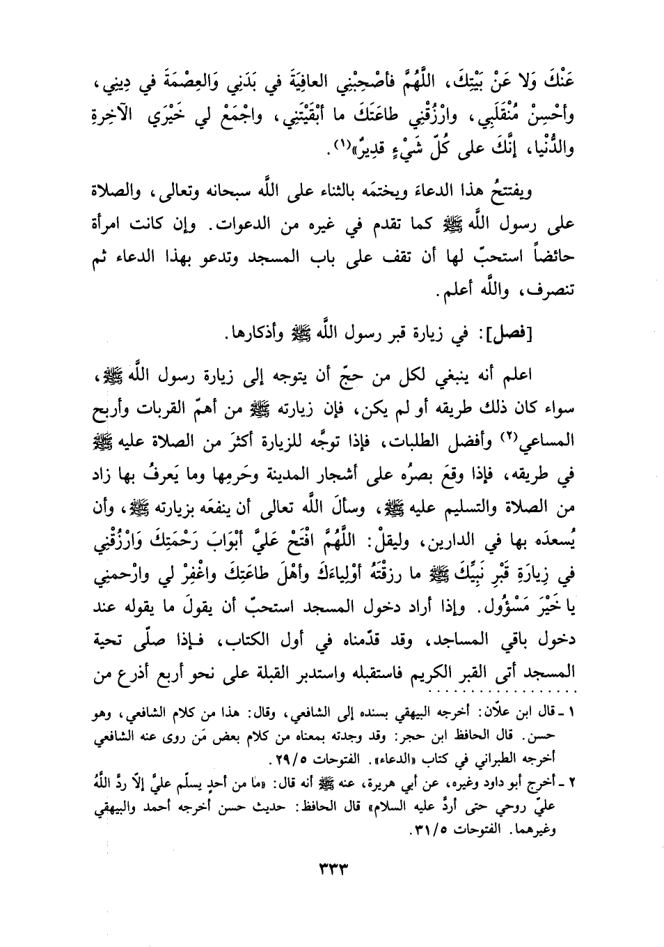 اعلم أنه ينبغي لكل من حجّ أن يتوجه إلى زيارة رسول الله صلى الله عليه وسلم، سواء كان ذلك طريقه أو لم يكن، فإن زيارته صلى الله عليه وسلم من أهمّ القربات وأربح المساعي (¬2) وأفضل الطلبات، فإذا توجَّه للزيارة أكثرَ من الصلاة عليه صلى الله عليه وسلم في طريقه، فإذا وقعَ بصرُه على أشجار المدينة وحَرمِها وما يَعرفُ بها زاد من الصلاة والتسليم عليه صلى الله عليه وسلم، وسألَ الله تعالى أن ينفعَه بزيارته صلى الله عليه وسلم، وأن يُسعدَه بها في الدارين، وليقلْ: اللَّهُمَّ افْتَحْ عَليَّ أبْوَابَ رَحْمَتِكَ وَارْزُقْنِي في زِيارَةِ قَبْرِ نَبِيِّكَ صلى الله عليه وسلم ما رزقْتَهُ أوْلِياءَكَ وأهْلَ طَاعَتِكَ واغْفِرْ لي وارْحمنِي يا خَيْرَ مَسْؤُول.
