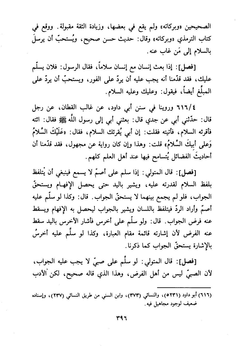 [فصل]: إذا بعث إنسان مع إنسان سلامًا، فقال الرسول: فلان يسلّم عليك، فقد قدّمنا أنه يجب عليه أن يردّ على الفور، ويستحبّ أن يردّ على المبلِّغ أيضًا، فيقول: وعليك وعليه السلام.