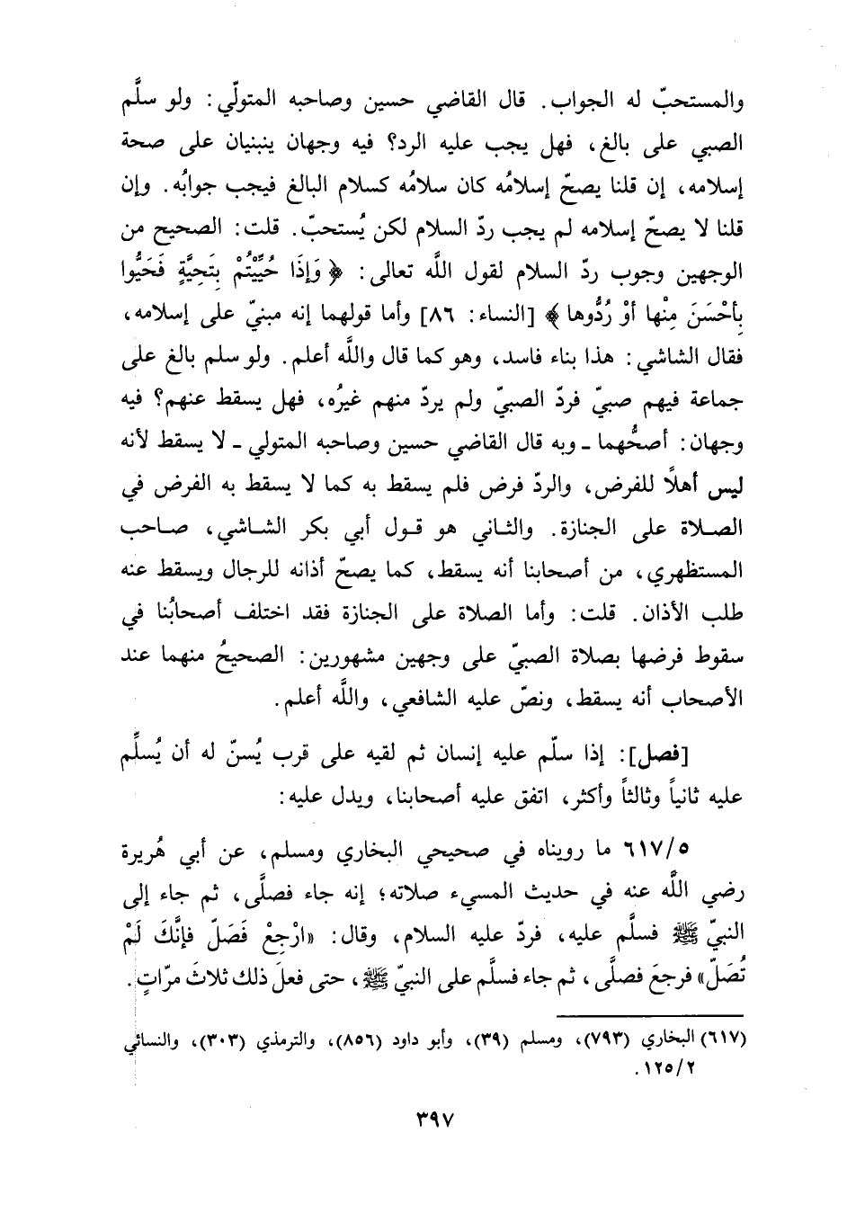 والمستحبّ له الجواب. قال القاضي حسين وصاحبه المتولّي: ولو سلَّم الصبي على بالغ، فهل يجب عليه الرد؟ فيه وجهان ينبنيان على صحة إسلامه، إن قلنا يصحّ إسلامُه كان سلامُه كسلام البالغ فيجب جوابُه. وإن قلنا لا يصحّ إسلامه لم يجب ردّ السلام لكن يُستحبّ. قلت: الصحيح منن الوجهين وجوب ردّ السلام لقول الله تعالى: {وَإِذَا حُيِّيْتُمْ بِتَحِيَّةٍ فَحَيُّوا بِأحْسَنَ مِنْها أوْ رُدُّوها} [النساء 86] وأما قولهما إنه مبنيّ على إسلامه، فقال الشاشي: هذا بناء فاسد، وهو كما قال والله أعلم. ولو سلم بالغ على جماعة فيهم صبيّ فردّ الصبيّ ولم يردّ منهم غيرُه، فهل يسقط عنهم؟ فيه وجهان: أصحُّهما ـ وبه قال القاضي حسين وصاحبه المتولي ـ لا يسقط لأنه ليس أهلًا للفرض، والردّ فرض فلم يسقط به كما لا يسقط به الفرض في الصلاة على الجنازة. والثاني هو قول أبي بكر الشاشي، صاحب المستظهري، من أصحابنا أنه يسقط، كما يصحّ أذانه للرجال ويسقط عنه طلب الأذان. قلت: وأما الصلاة على الجنازة فقد اختلف أصحابُنا في سقوط فرضها بصلاة الصبيّ على وجهين مشهورين: الصحيحُ منهما عند الأصحاب أنه يسقط، ونصّ عليه الشافعي، والله أعلم.