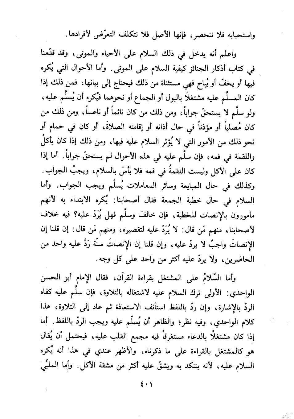 واعلم أنه يدخل في ذلك السلام على الأحياء والموتى، وقد قدّمنا في كتاب أذكار الجنائز كيفية السلام على الموتى. وأما الأحوال التي يُكره فيها أو يخفّ أو يُباح فهي مستثناة من ذلك فيحتاج إلى بيانها، فمن ذلك إذا كان المسلَّم عليه مشتغلًا بالبول أو الجماع أو نحوهما فيُكره أن يُسلَّم عليه، ولو سلَّم لا يستحقّ جوابًا، ومن ذلك من كان نائمًا أو ناعسًا، ومن ذلك من كان مُصليًا أو مؤذنًا في حال أذانه أو إقامته الصلاةَ، أو كان في حمام أو نحو ذلك من الأمور التي لا يُؤثر السلام عليه فيها، ومن ذلك إذا كان يأكلُ واللقمة في فمه، فإن سلَّم عليه في هذه الأحوال لم يستحقّ جوابًا. أما إذا كان على الأكل وليست اللقمةُ في فمه فلا بأسَ بالسلام، ويجبُ الجواب. وكذلك في حال المبايعة وسائر المعاملات يُسلّم ويجب الجواب. وأما السلام في حال خطبة الجمعة فقال أصحابنا: يُكره الابتداء به لأنهم مأمورون بالإِنصات للخطبة، فإن خالفَ وسلَّم فهل يُرَدّ عليه؟ فيه خلاف لأصحابنا، منهم مَن قال: لا يُرَدّ عليه لتقصيره، ومنهم مَن قال: إن قلنا إن الإِنصاتَ واجبٌ لا يردّ عليه، وإن قلنا إن الإِنصاتَ سنّة رَدَّ عليه واحد من الحاضرين، ولا يردّ عليه أكثر من واحد على كل وجه.