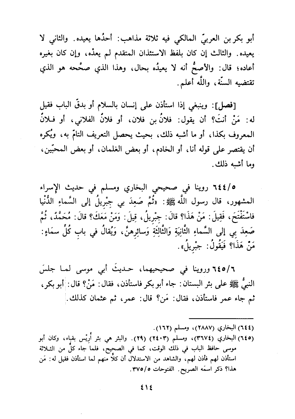 [645] البخاري (3674)، ومسلم (2403) (29). والبئر هي بئر أَرِيْس بقباء، وكان أبو موسى حافظ الباب في ذلك الوقت، كما في الصحيح، فلما جاء كلٌّ من الثلاثة استأذن لهم فأذن لهم، والشاهد من الاستدلال أن كلًا منهم لما استأذن فقيل له: مَن هذا؟ ذكر اسمَه الصريح. الفتوحات 5/ 375.